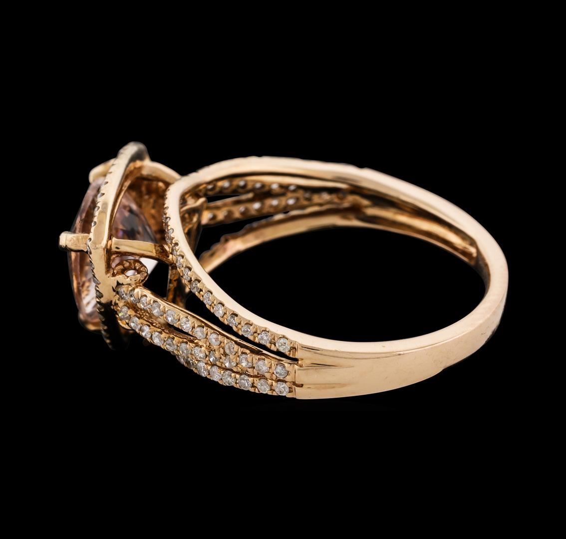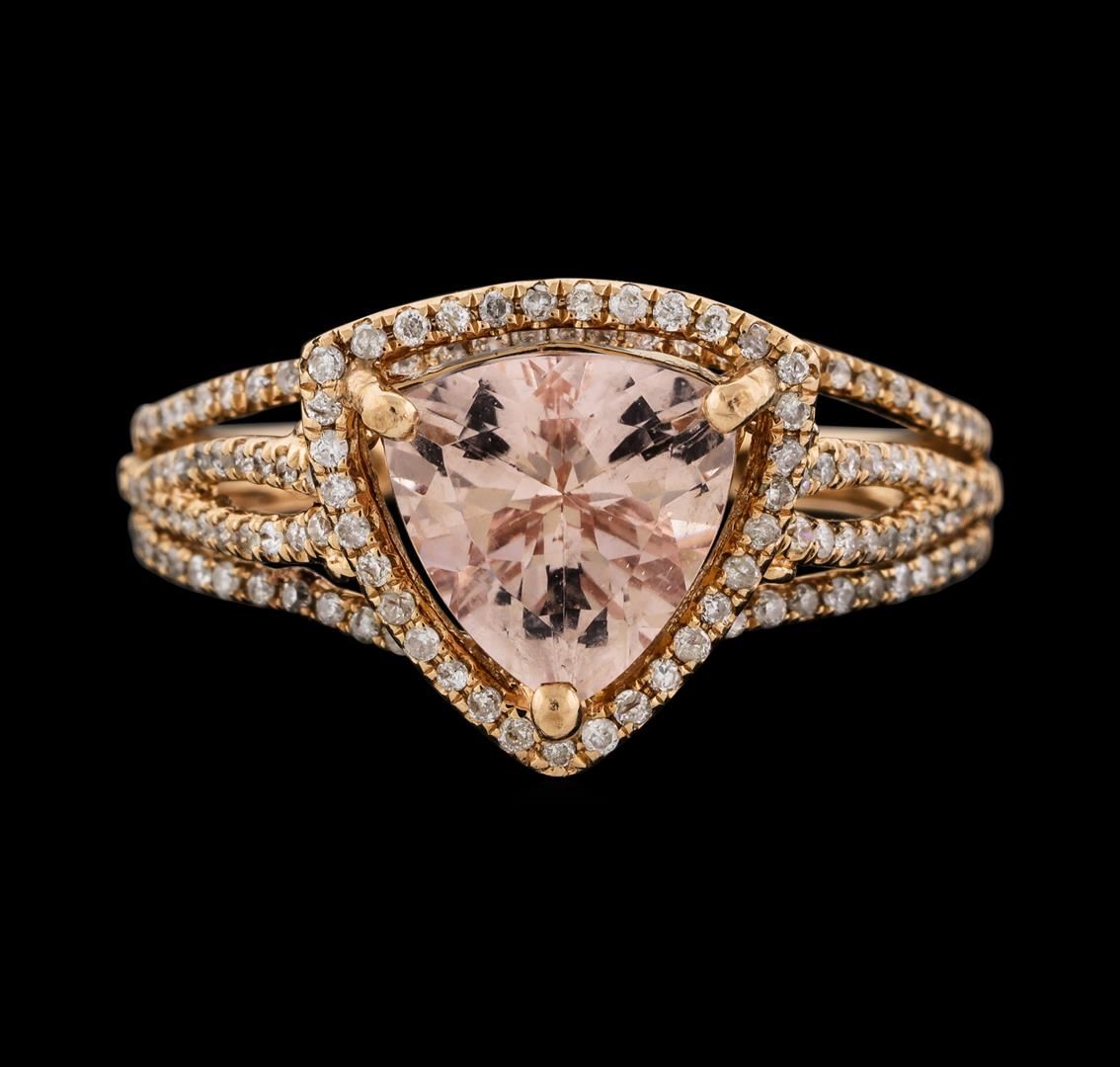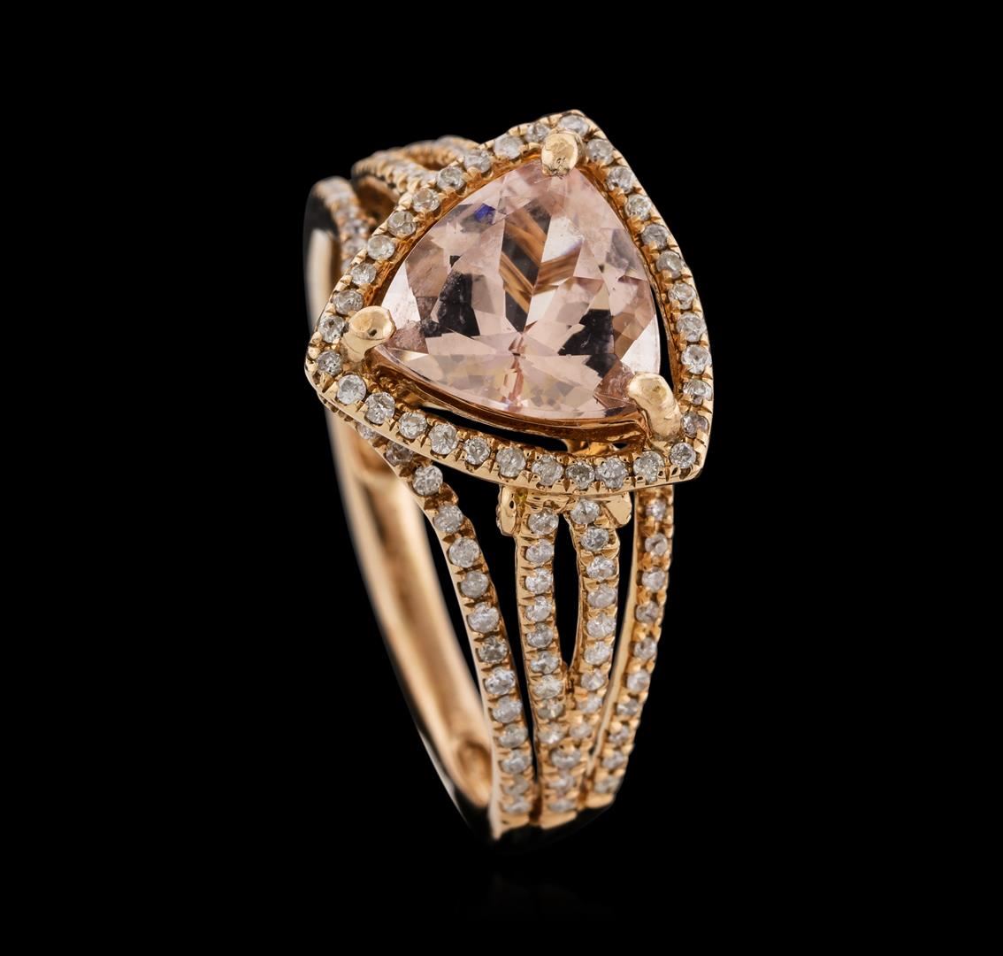 One electronically tested 14KT rose gold lady's cast fashion ring with a triple split shank with halo with a bright polish finish. The featured lady's ring has a shank measuring 1.95 millimeters wide. Identified with markings of '14K'. Condition is new, good workmanship. Containing: One prong set triangle modified brilliant cut natural morganite, measuring 8.20 x 8.15 x 4.84mm, (depth est.) approximate weight of 1.53ct., clarity is slightly included, very light, moderately strong, reddish orange color, (GIA rO 2/4), cut is very good. Transmitting light with a minimum of distortion, transparent. Colored gemstones are presumed to have been subjected to commonly used enhancement processes. Graded in the setting. One Hundred Thirty-Two prong set round brilliant cut diamonds, measuring 0.95 - 0.85 x 0.55mm (depth est.) approximate total weight of 132 Stones = 0.35ct. Graded in the setting. Clarity SI-2 to I-1. Color: H - I Cut Good. Total Weight of Colored Stones 1.53ct.. Total Weight of Diamonds 0.35ct.. Total Weight of Ring 3.10gm. GAS Appraised at $3,120.00.