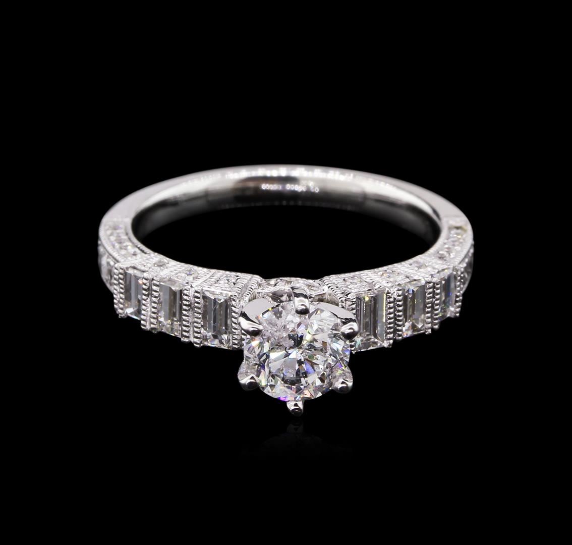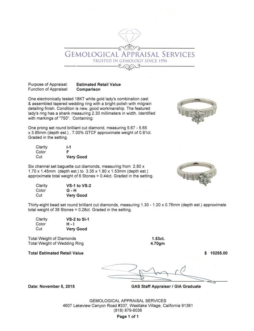One electronically tested 18KT white gold lady's combination cast & assembled tapered wedding ring with a bright polish with milgrain detailing finish. The featured lady's ring has a shank measuring 2.30 millimeters in width. Identified with markings of "750". Condition is new, good workmanship. Containing: One prong set round brilliant cut diamond, measuring 5.67 - 5.65 x 3.85mm (depth est.) , 7.00% GTCF approximate weight of 0.81ct. Graded in the setting. Clarity: I-1. Color: F. Cut Very Good Six channel set baguette cut diamonds, measuring from 2.80 x 1.70 x 1.45mm (depth est.) to 3.35 x 1.80 x 1.53mm (depth est.) approximate total weight of 6 Stones = 0.44ct. Graded in the setting. Clarity: VS-1 to VS-2. Color: G - Very Good Thirty-Eight bead set round brilliant cut diamonds, measuring 1.30 - 1.20 x 0.76mm (depth est.) approximate total weight of 38 Stones = 0.28ct. Graded in the setting. Clarity: VS-2 to SI-1. Color: H - I. Cut Very Good. Total Weight of Diamonds 1.53ct. Total Weight of Wedding Ring 4.70gm GAS Appraised at $10,255.00.
