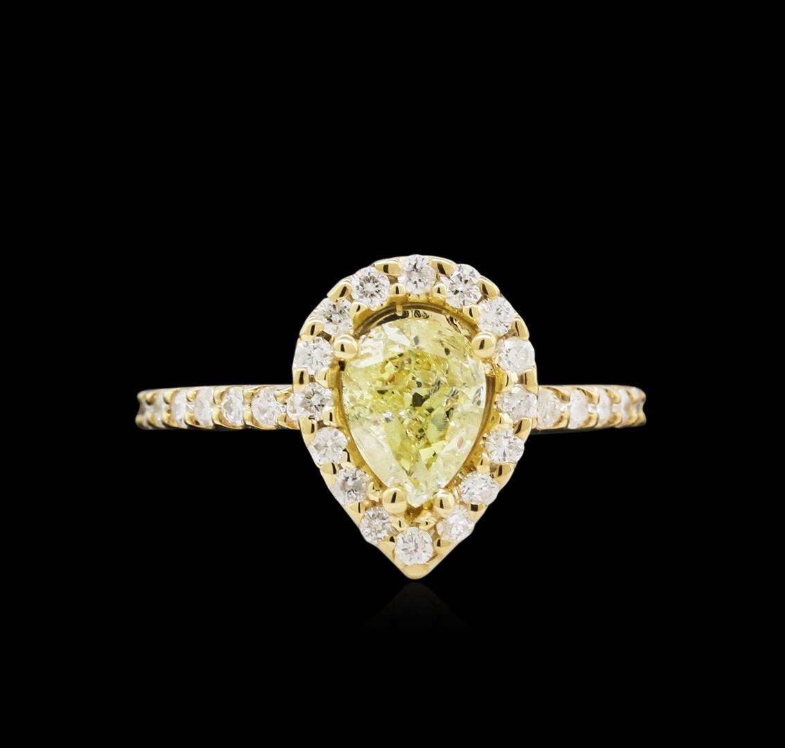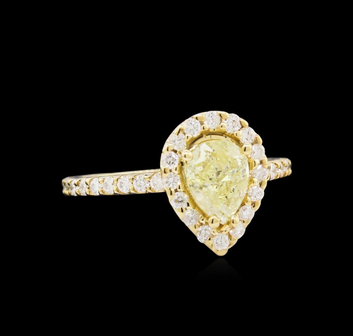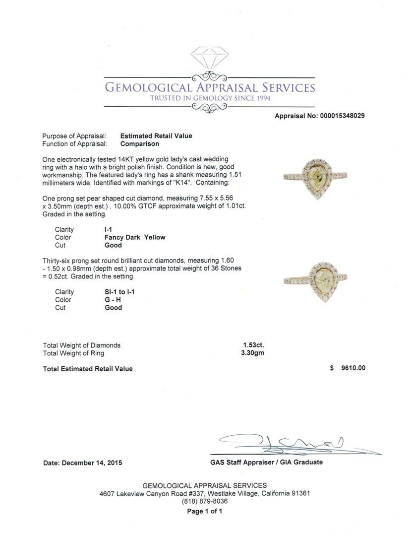 One electronically tested 14KT yellow gold lady's cast wedding ring with a halo with a bright polish finish. The featured lady's ring has a shank measuring 1.51 millimeters wide. Identified with markings of "K14". Condition is new, good workmanship. Containing: One prong set pear shaped cut diamond, measuring 7.55 x 5.56 x 3.50mm (depth est.) , 10.00.%. GTCF approximate weight of 1.01ct. Graded in the setting. Clarity: I-1 Cut Good Thirty-Six prong set round brilliant cut diamonds, measuring 1.60 - 1.50 x 0.98mm (depth est.) approximate total weight of 36 Stones = 0.52ct. Graded in the setting. Clarity: SI-1 to I-1. Color: G - Good. Total Weight of Diamonds 1.53ct. Total Weight of Ring 3.30gm. GAS Appraised at $9,610.00.