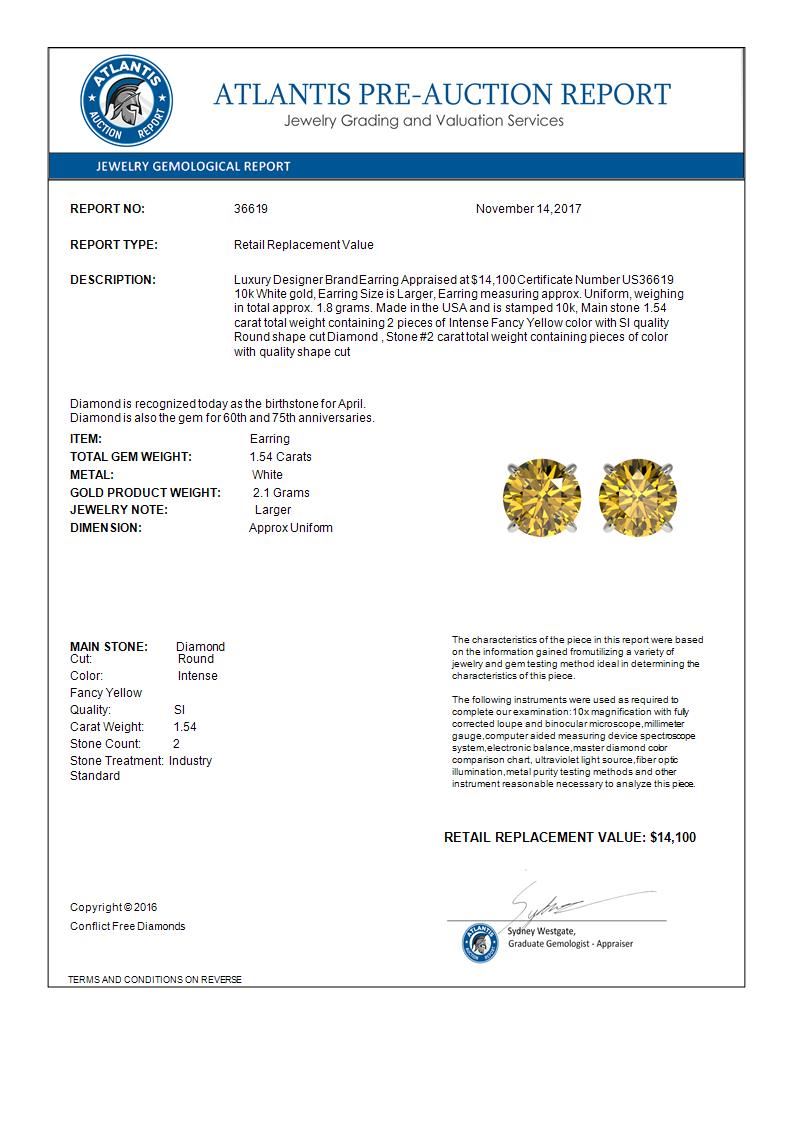 36619 - REF-192A2V ---- 1.54 CTW Certified Intense Yellow SI Diamond Solitaire Stud Earrings 10K White Gold ---- Luxury Designer Brand Earring Appraised at $14,100 Certificate Number US36619 10k White gold, Earring Size is Larger, Earring measuring approx. Uniform, weighing in total approx. 1.8 grams. Made in the USA and is stamped 10k, Main stone 1.54 carat total weight containing 2 pieces of Intense Fancy Yellow color with SI quality Round shape cut Diamond , Stone #2 carat total weight containing pieces of color with quality shape cut