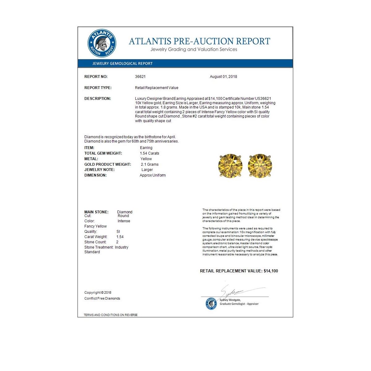 REF-192Y2K -36621 ---- 1.54 CTW Certified Intense Yellow SI Diamond Solitaire Stud Earrings 10K Yellow Gold ---- Luxury Designer Brand Earring Appraised at $14,100 Certificate Number US36621 10k Yellow gold, Earring Size is Larger, Earring measuring approx. Uniform, weighing in total approx. 1.8 grams. Made in the USA and is stamped 10k, Main stone 1.54 carat total weight containing 2 pieces of Intense Fancy Yellow color with SI quality Round shape cut Diamond , Stone #2 carat total weight containing pieces of color with quality shape cut