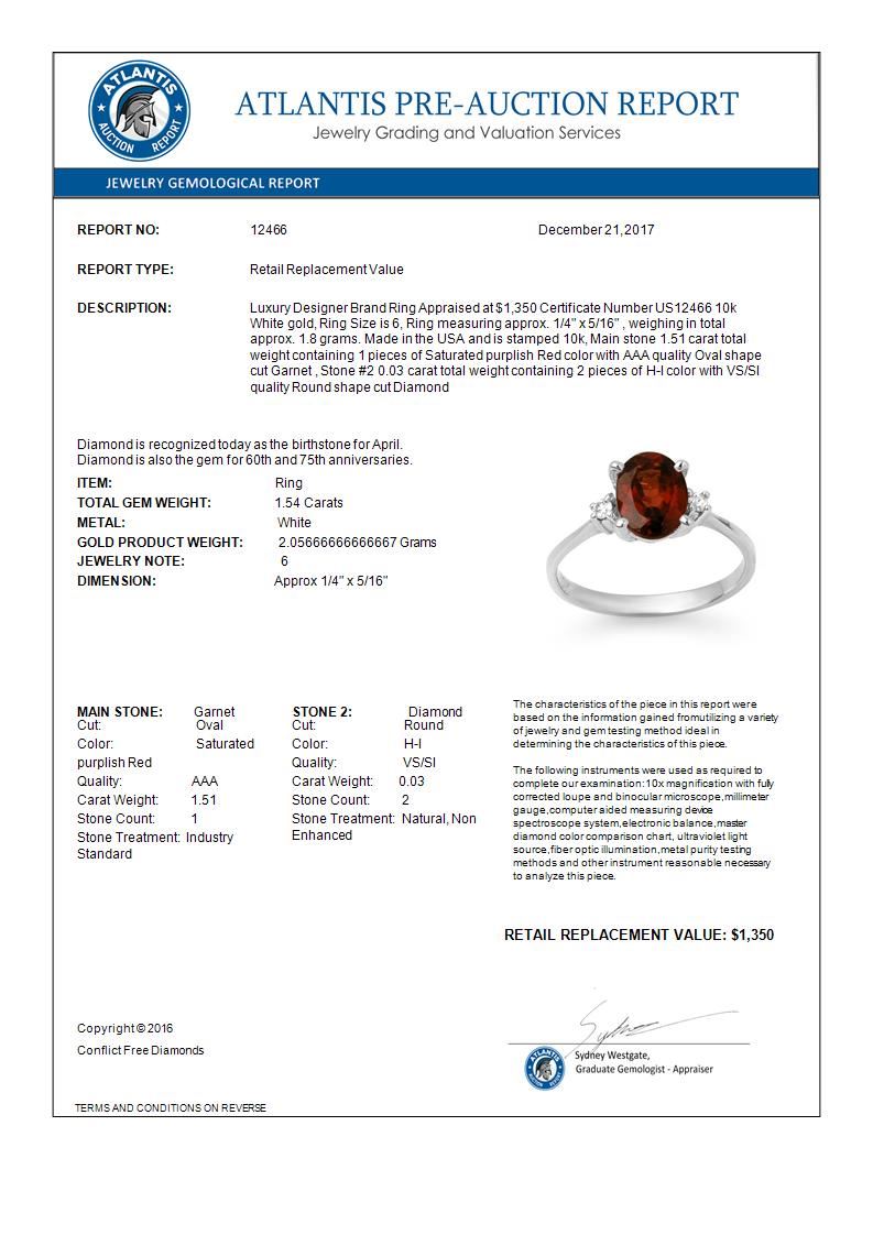 REF-22W2F -12466 ---- 1.54 CTW Garnet & Diamond Ring 10K White Gold ---- Luxury Designer Brand Ring Appraised at $1,350 Certificate Number US12466 10k White gold, Ring Size is 6, Ring measuring approx. 1/4" x 5/16" , weighing in total approx. 1.8 grams. Made in the USA and is stamped 10k, Main stone 1.51 carat total weight containing 1 pieces of Saturated purplish Red color with AAA quality Oval shape cut Garnet , Stone #2 0.03 carat total weight containing 2 pieces of H-I color with VS/SI quality Round shape cut Diamond