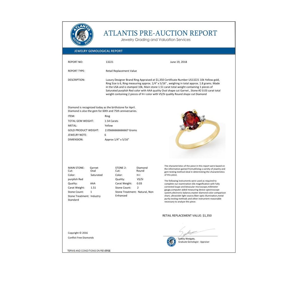 REF-22A2X -13221 ---- 1.54 CTW Garnet & Diamond Ring 10K Yellow Gold ---- Luxury Designer Brand Ring Appraised at $1,350 Certificate Number US13221 10k Yellow gold, Ring Size is 6, Ring measuring approx. 1/4" x 5/16" , weighing in total approx. 1.8 grams. Made in the USA and is stamped 10k, Main stone 1.51 carat total weight containing 1 pieces of Saturated purplish Red color with AAA quality Oval shape cut Garnet , Stone #2 0.03 carat total weight containing 2 pieces of H-I color with VS/SI quality Round shape cut Diamond