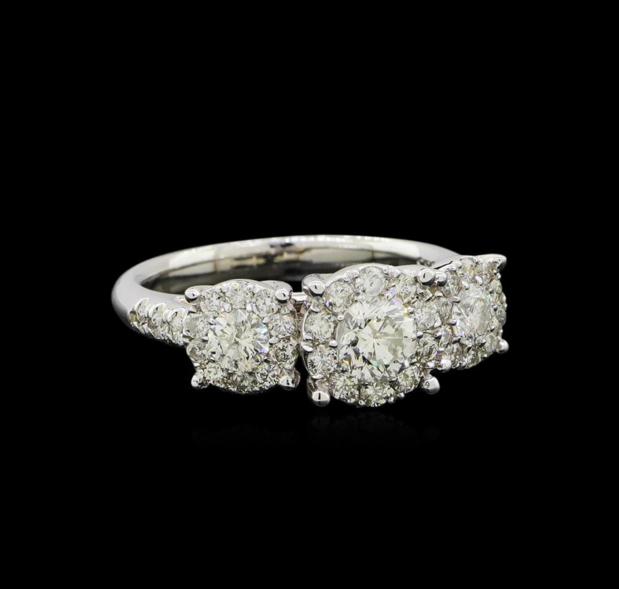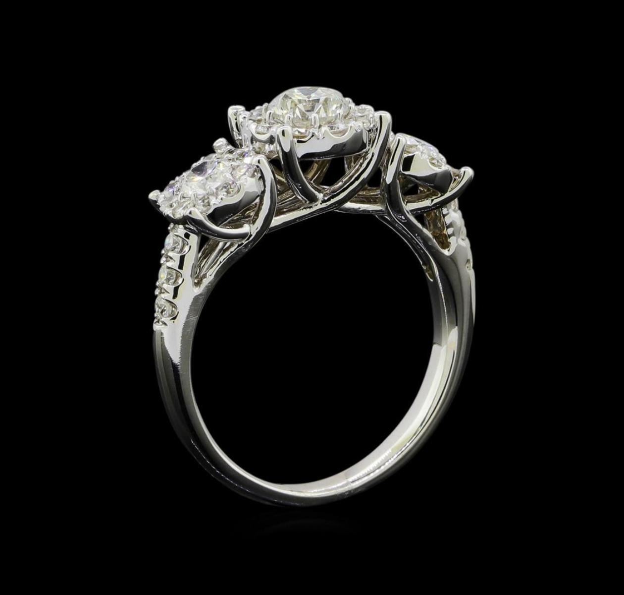 One electronically tested 14KT white gold lady's cast fashion ring with a bright polish finish. The featured lady's ring has a shank measuring 2.38 millimeters wide. Identified with markings of '585'. Condition is new, good workmanship. Containing: One prong set round brilliant cut diamond, measuring 5.14 - 5.09 x 3.31mm (depth est.) approximate weight of 0.52ct. Graded in the setting. Clarity I-1. Color: H - I Cut Good Two prong set round brilliant cut diamonds, measuring 3.72 - 3.68 x 2.22mm (depth est.) approximate total weight of 2 Stones = 0.35ct. Graded in the setting. Clarity SI-2 to I-1. Color: H - I Cut Good Thirty-Six prong set round brilliant cut diamonds, measuring 1.90 - 1.60 x 1.09mm (depth est.) approximate total weight of 36 Stones = 0.67ct. Graded in the setting. Clarity SI-1 to SI-2. Color: G - I Cut Good. Total Weight of Diamonds 1.54ct.. Total Weight of Ring 5.30gm. GAS Appraised.