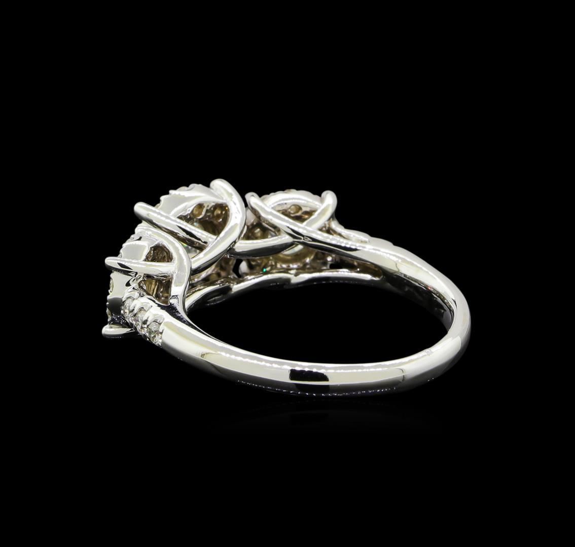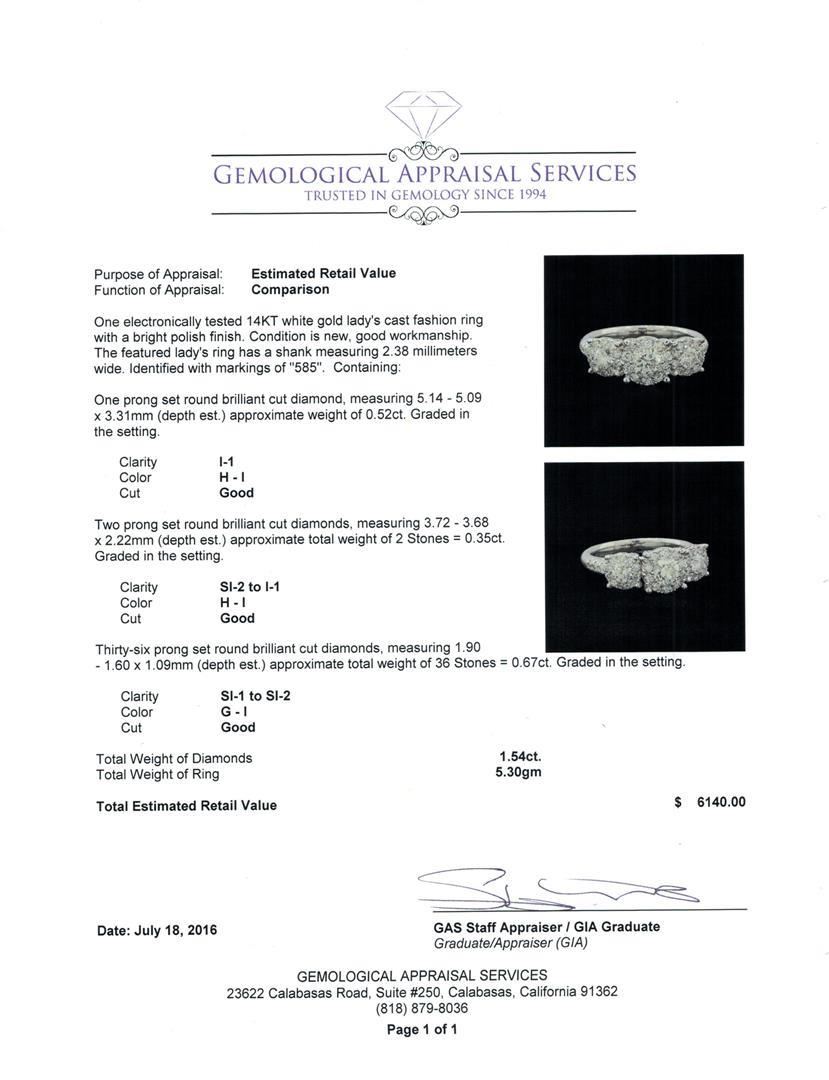 One electronically tested 14KT white gold lady's cast fashion ring with a bright polish finish. The featured lady's ring has a shank measuring 2.38 millimeters wide. Identified with markings of '585'. Condition is new, good workmanship. Containing: One prong set round brilliant cut diamond, measuring 5.14 - 5.09 x 3.31mm (depth est.) approximate weight of 0.52ct. Graded in the setting. Clarity I-1. Color: H - I Cut Good Two prong set round brilliant cut diamonds, measuring 3.72 - 3.68 x 2.22mm (depth est.) approximate total weight of 2 Stones = 0.35ct. Graded in the setting. Clarity SI-2 to I-1. Color: H - I Cut Good Thirty-Six prong set round brilliant cut diamonds, measuring 1.90 - 1.60 x 1.09mm (depth est.) approximate total weight of 36 Stones = 0.67ct. Graded in the setting. Clarity SI-1 to SI-2. Color: G - I Cut Good. Total Weight of Diamonds 1.54ct.. Total Weight of Ring 5.30gm. GAS Appraised.