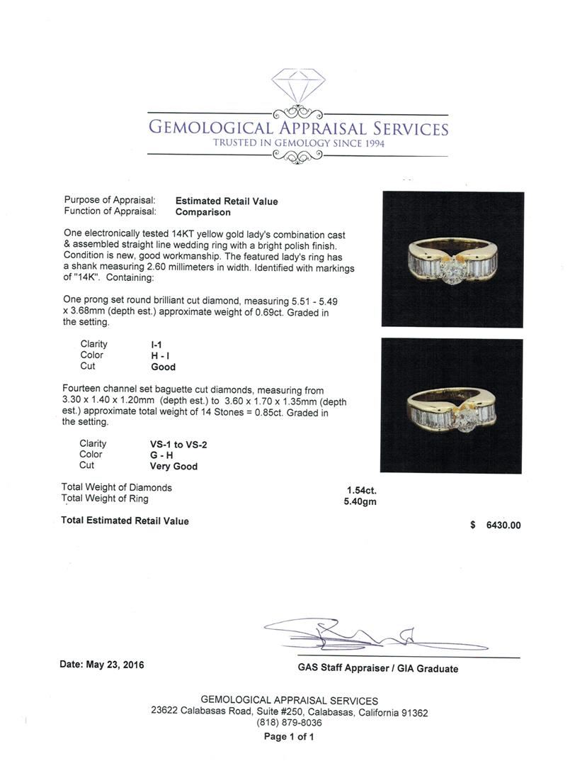 One electronically tested 14KT yellow gold lady's combination cast & assembled straight line wedding ring with a bright polish finish. The featured lady's ring has a shank measuring 2.60 millimeters in width. Identified with markings of "14K". Condition is new, good workmanship. Containing: One prong set round brilliant cut diamond, measuring 5.51 - 5.49 x 3.68mm (depth est.) approximate weight of 0.69ct. Graded in the setting. Clarity: I-1. Color: H - I. Cut Good Fourteen channel set baguette cut diamonds, measuring from 3.30 x 1.40 x 1.20mm (depth est.) to 3.60 x 1.70 x 1.35mm (depth est.) approximate total weight of 14 Stones = 0.85ct. Graded in the setting. Clarity: VS-1 to VS-2. Color: G - Very Good. Total Weight of Diamonds 1.54ct. Total Weight of Ring 5.40gm. GAS Appraised at $6,430.00.