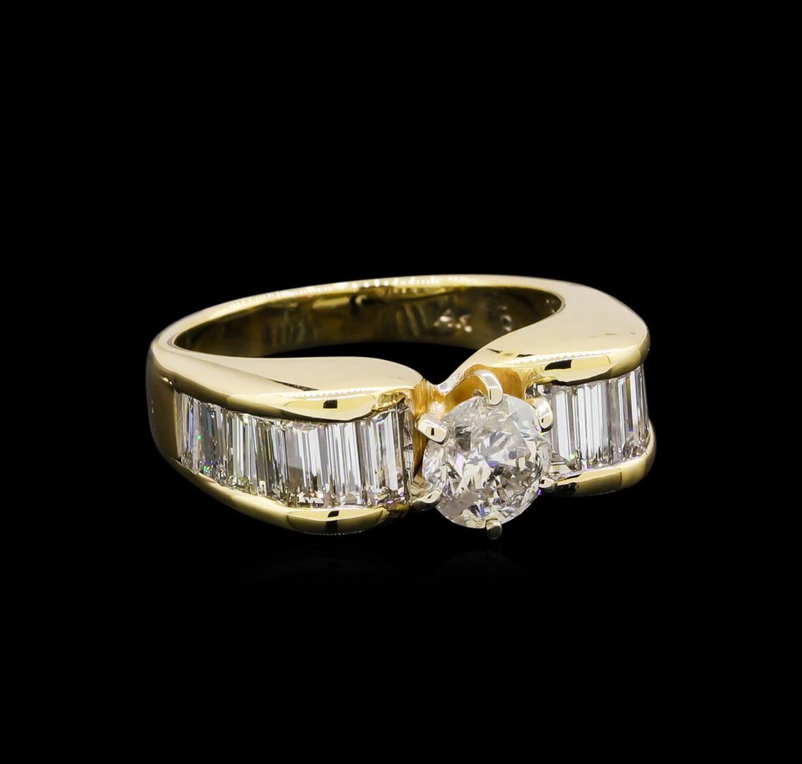 One electronically tested 14KT yellow gold lady's combination cast & assembled straight line wedding ring with a bright polish finish. The featured lady's ring has a shank measuring 2.60 millimeters in width. Identified with markings of "14K". Condition is new, good workmanship. Containing: One prong set round brilliant cut diamond, measuring 5.51 - 5.49 x 3.68mm (depth est.) approximate weight of 0.69ct. Graded in the setting. Clarity: I-1. Color: H - I. Cut Good Fourteen channel set baguette cut diamonds, measuring from 3.30 x 1.40 x 1.20mm (depth est.) to 3.60 x 1.70 x 1.35mm (depth est.) approximate total weight of 14 Stones = 0.85ct. Graded in the setting. Clarity: VS-1 to VS-2. Color: G - Very Good. Total Weight of Diamonds 1.54ct. Total Weight of Ring 5.40gm. GAS Appraised at $6,430.00.