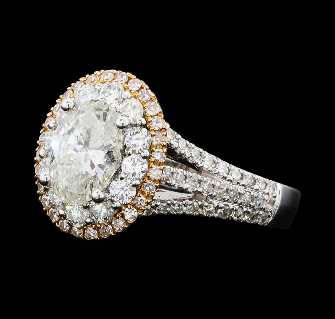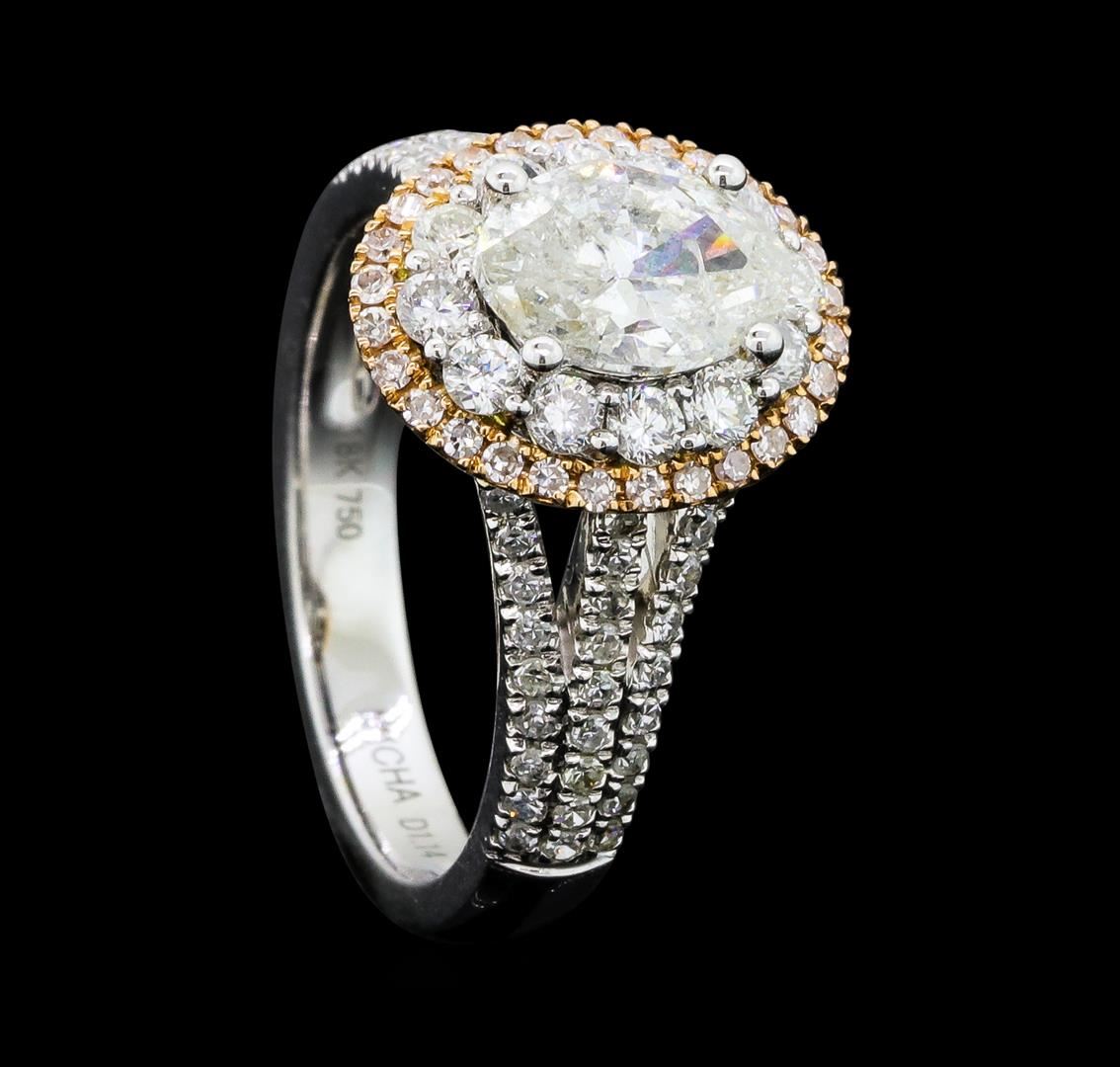 One electronically tested 18KT white and yellow gold lady's combination cast & assembled wedding ring with a triple split shank basket halo with a bright polish finish. The featured lady's ring has a rose gold plated center section and a shank measuring 2.96 millimeters wide. Identified with markings of '18K 750'. Condition is new, good workmanship. Containing: One prong set oval shaped cut diamond, measuring 8.12 x 5.87 x 3.58mm (depth est.) approximate weight of 1.14ct. Graded in the setting. Color I Clarity I-2 Cut Good Twelve prong set round brilliant cut diamonds, measuring 2.10 - 2.00 x 1.27mm (depth est.) approximate total weight of 12 Stones = 0.40ct. Graded in the setting. Color G - H Clarity SI-1 to I-1 Cut Very Good Eighty-Four prong set single cut diamonds, measuring 1.20 - 1.00 x 0.68mm (depth est.) approximate total weight of 84 Stones = 0.42ct. Graded in the setting. Color H - I Clarity SI-2 to I-2 Cut Good. Total Weight of Diamonds 1.96ct.. Total Weight of Ring 6.20gm GAS Appraised at $7790.00. GAS Appraised at $7,790.00.