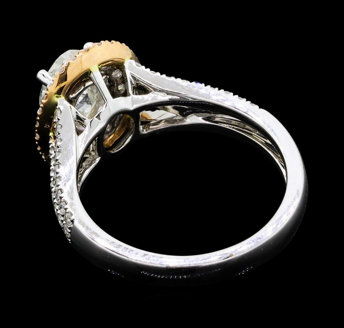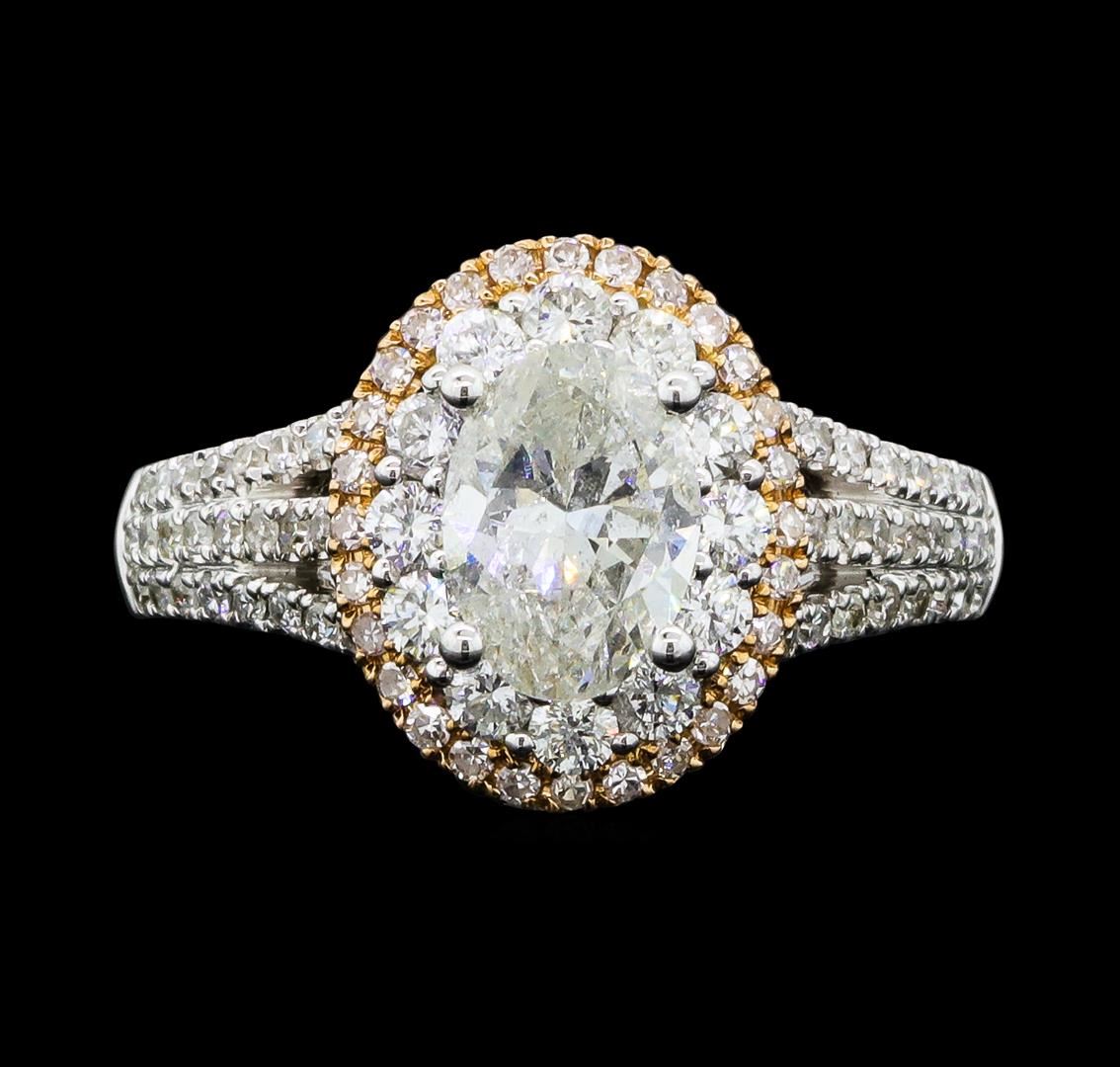 One electronically tested 18KT white and yellow gold lady's combination cast & assembled wedding ring with a triple split shank basket halo with a bright polish finish. The featured lady's ring has a rose gold plated center section and a shank measuring 2.96 millimeters wide. Identified with markings of '18K 750'. Condition is new, good workmanship. Containing: One prong set oval shaped cut diamond, measuring 8.12 x 5.87 x 3.58mm (depth est.) approximate weight of 1.14ct. Graded in the setting. Color I Clarity I-2 Cut Good Twelve prong set round brilliant cut diamonds, measuring 2.10 - 2.00 x 1.27mm (depth est.) approximate total weight of 12 Stones = 0.40ct. Graded in the setting. Color G - H Clarity SI-1 to I-1 Cut Very Good Eighty-Four prong set single cut diamonds, measuring 1.20 - 1.00 x 0.68mm (depth est.) approximate total weight of 84 Stones = 0.42ct. Graded in the setting. Color H - I Clarity SI-2 to I-2 Cut Good. Total Weight of Diamonds 1.96ct.. Total Weight of Ring 6.20gm GAS Appraised at $7790.00. GAS Appraised at $7,790.00.