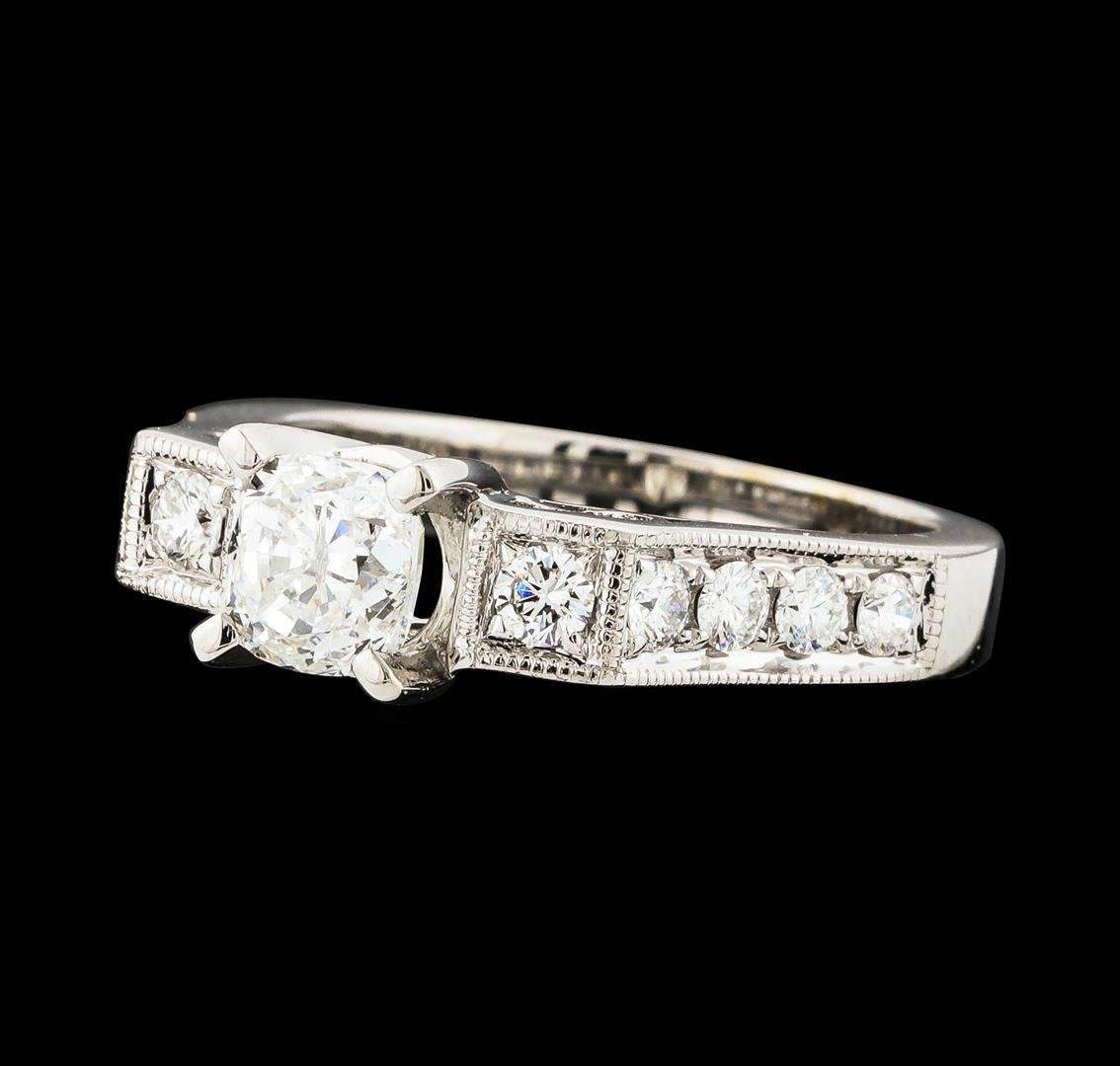 One electronically tested 18KT white gold lady's cast three stone wedding ring with a cathedral shank with a bright polish with milgrain detailing finish. The featured lady's ring has a shank measuring 2.88 millimeters wide. Identified with markings of '18K 750'. Condition is new, good workmanship. Containing: One prong set cushion cut diamond, measuring 5.40 x 5.15 x 4.12mm (depth est.) , 5.00.%. GTCF approximate weight of 1.01ct. Graded in the setting. Clarity I-1. Color: G - H Cut Very Good Two prong set round brilliant cut diamonds, measuring 2.90 - 2.85 x 1.78mm (depth est.) approximate total weight of 2 Stones = 0.18ct. Graded in the setting. Clarity VS-2 to SI-1. Color: G - H Cut Very Good Eight prong set round brilliant cut diamonds, measuring 2.30 - 2.20 x 1.40mm (depth est.) approximate total weight of 8 Stones = 0.35ct. Graded in the setting. Clarity VS-2 to SI-1. Color: H - I Cut Good. Total Weight of Diamonds 1.54ct.. Total Weight of Ring 5.50gm. GAS Appraised at $9,495.00.