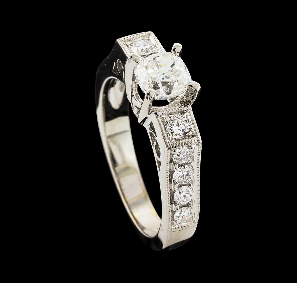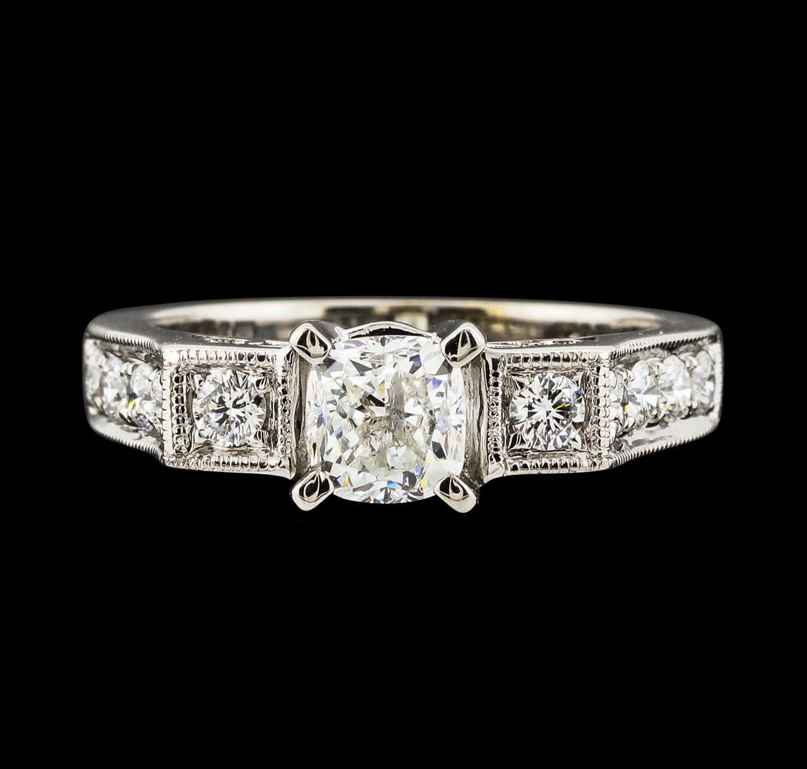 One electronically tested 18KT white gold lady's cast three stone wedding ring with a cathedral shank with a bright polish with milgrain detailing finish. The featured lady's ring has a shank measuring 2.88 millimeters wide. Identified with markings of '18K 750'. Condition is new, good workmanship. Containing: One prong set cushion cut diamond, measuring 5.40 x 5.15 x 4.12mm (depth est.) , 5.00.%. GTCF approximate weight of 1.01ct. Graded in the setting. Clarity I-1. Color: G - H Cut Very Good Two prong set round brilliant cut diamonds, measuring 2.90 - 2.85 x 1.78mm (depth est.) approximate total weight of 2 Stones = 0.18ct. Graded in the setting. Clarity VS-2 to SI-1. Color: G - H Cut Very Good Eight prong set round brilliant cut diamonds, measuring 2.30 - 2.20 x 1.40mm (depth est.) approximate total weight of 8 Stones = 0.35ct. Graded in the setting. Clarity VS-2 to SI-1. Color: H - I Cut Good. Total Weight of Diamonds 1.54ct.. Total Weight of Ring 5.50gm. GAS Appraised at $9,495.00.