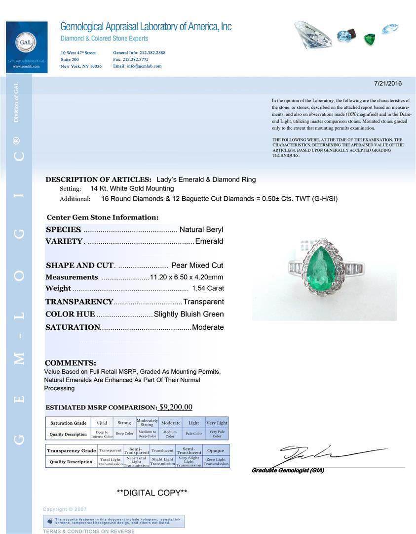 One Lady's Emerald and Diamond Ring. Setting: 14 Kt. White Gold Mounting. Additional: 16 Round Diamonds and 12 Baguette Cut Diamonds = 0.50 Cts. TWT (G-H/SI). Center Gem Stone Information: Species: Natural Beryl. Variety: Emerald. Shape and Cut: Pear Mixed Cut. Measurements: 11.20 x 6.50 x 4.20mm. Weight: 1.54 Carat. Transparency: Transparent. Color Hue: Slightly Bluish Green. Saturation: Moderate. Total Weight: 4.47 grams.