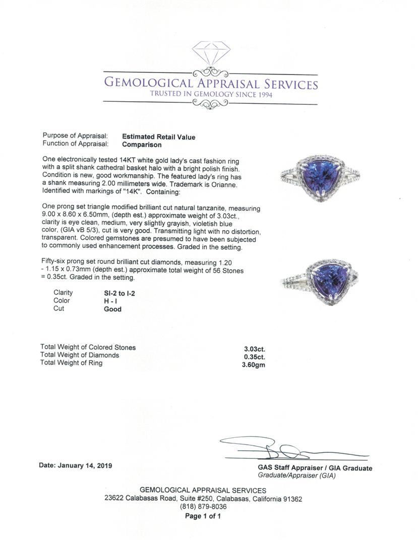 One electronically tested 14KT white gold lady's cast fashion ring with a vintage motif with a bright polish finish. The featured lady's ring has filigree detailing and a shank measuring 3.25 millimeters wide. Identified with markings of '14K'. Condition is new, good workmanship. Containing: One bezel set oval modified mixed cut natural emerald, measuring 8.60 x 6.60 x 3.85mm, (depth est.) 5%. bulge factor, approximate weight of 1.39ct., clarity is moderately included, medium, moderately strong, green color, (GIA G 5/4), cut is good. Transmitting light somewhat diffusely, transparent to translucent. Naturally occurring internal & external characteristics are present. Indications of oil residue. Colored gemstones are presumed to have been subjected to commonly used enhancement processes. Graded in the setting. Four prong set round brilliant cut diamonds, measuring 2.20 - 2.10 x 1.33mm (depth est.) approximate total weight of 4 Stones = 0.15ct. Graded in the setting. Color H - I Clarity VS-2 to SI-1 Cut Good Thirty prong set round brilliant cut diamonds, measuring 1.20 - 1.10 x 0.69mm (depth est.) approximate total weight of 30 Stones = 0.14ct. Graded in the setting. Color H - I Clarity VS-2 to SI-1 Cut Good. Total Weight of Colored Stones 1.39ct.. Total Weight of Diamonds 0.29ct.. Total Weight of Ring 6.60gm GAS Appraised at $2850.00. GAS Appraised at $2,850.00.