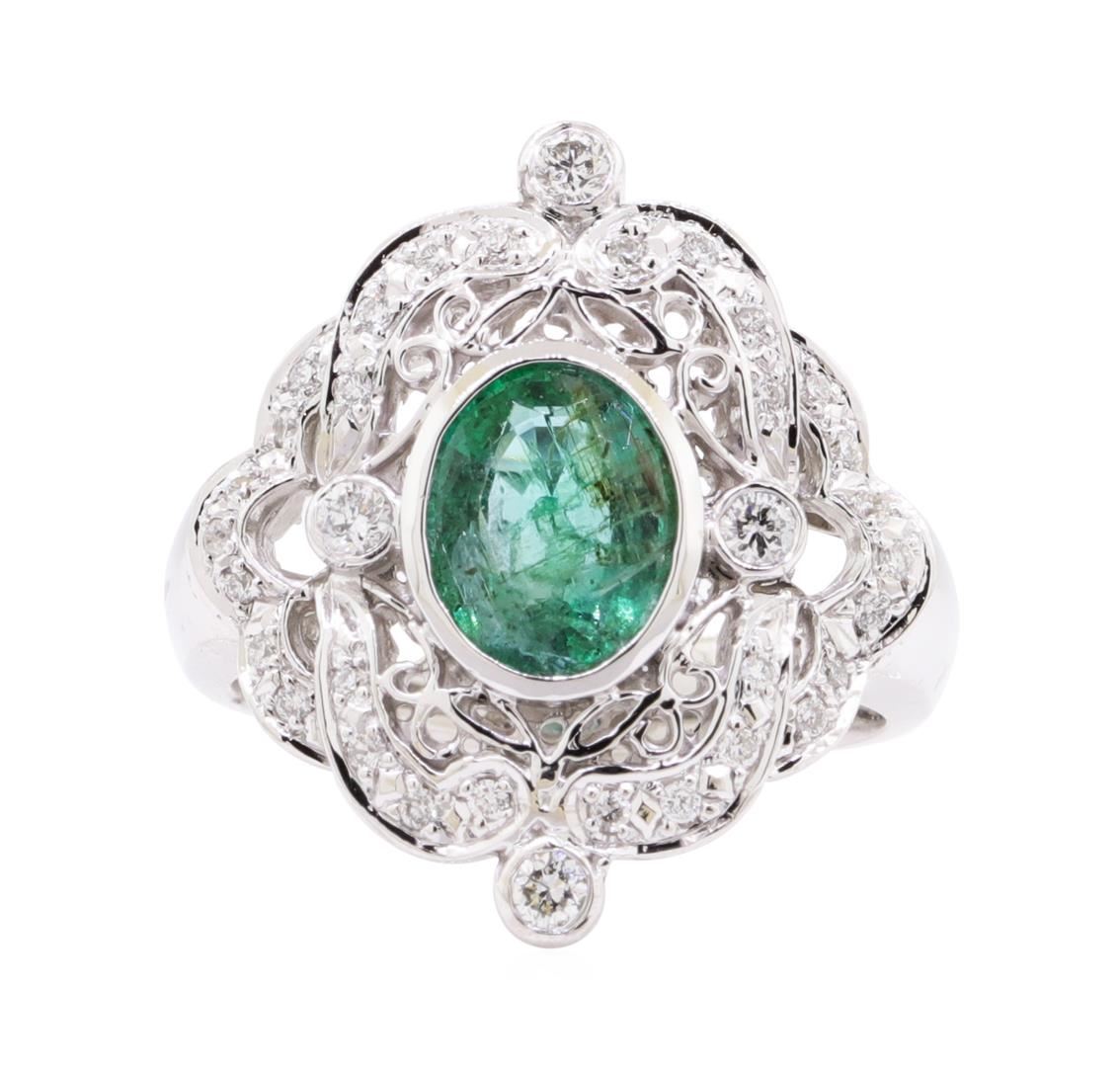One electronically tested 14KT white gold lady's cast fashion ring with a vintage motif with a bright polish finish. The featured lady's ring has filigree detailing and a shank measuring 3.25 millimeters wide. Identified with markings of '14K'. Condition is new, good workmanship. Containing: One bezel set oval modified mixed cut natural emerald, measuring 8.60 x 6.60 x 3.85mm, (depth est.) 5%. bulge factor, approximate weight of 1.39ct., clarity is moderately included, medium, moderately strong, green color, (GIA G 5/4), cut is good. Transmitting light somewhat diffusely, transparent to translucent. Naturally occurring internal & external characteristics are present. Indications of oil residue. Colored gemstones are presumed to have been subjected to commonly used enhancement processes. Graded in the setting. Four prong set round brilliant cut diamonds, measuring 2.20 - 2.10 x 1.33mm (depth est.) approximate total weight of 4 Stones = 0.15ct. Graded in the setting. Color H - I Clarity VS-2 to SI-1 Cut Good Thirty prong set round brilliant cut diamonds, measuring 1.20 - 1.10 x 0.69mm (depth est.) approximate total weight of 30 Stones = 0.14ct. Graded in the setting. Color H - I Clarity VS-2 to SI-1 Cut Good. Total Weight of Colored Stones 1.39ct.. Total Weight of Diamonds 0.29ct.. Total Weight of Ring 6.60gm GAS Appraised at $2850.00. GAS Appraised at $2,850.00.
