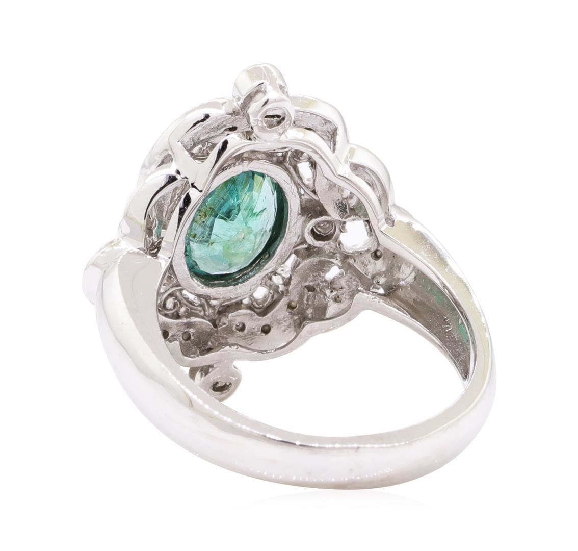 One electronically tested 14KT white gold lady's cast fashion ring with a vintage motif with a bright polish finish. The featured lady's ring has filigree detailing and a shank measuring 3.25 millimeters wide. Identified with markings of '14K'. Condition is new, good workmanship. Containing: One bezel set oval modified mixed cut natural emerald, measuring 8.60 x 6.60 x 3.85mm, (depth est.) 5%. bulge factor, approximate weight of 1.39ct., clarity is moderately included, medium, moderately strong, green color, (GIA G 5/4), cut is good. Transmitting light somewhat diffusely, transparent to translucent. Naturally occurring internal & external characteristics are present. Indications of oil residue. Colored gemstones are presumed to have been subjected to commonly used enhancement processes. Graded in the setting. Four prong set round brilliant cut diamonds, measuring 2.20 - 2.10 x 1.33mm (depth est.) approximate total weight of 4 Stones = 0.15ct. Graded in the setting. Color H - I Clarity VS-2 to SI-1 Cut Good Thirty prong set round brilliant cut diamonds, measuring 1.20 - 1.10 x 0.69mm (depth est.) approximate total weight of 30 Stones = 0.14ct. Graded in the setting. Color H - I Clarity VS-2 to SI-1 Cut Good. Total Weight of Colored Stones 1.39ct.. Total Weight of Diamonds 0.29ct.. Total Weight of Ring 6.60gm GAS Appraised at $2850.00. GAS Appraised.