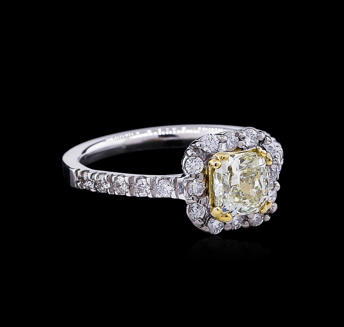 One electronically tested 14KT white and yellow gold lady's combination cast & assembled wedding ring with a cathedral shank with a bright polish finish. The featured lady's ring has a shank measuring 2.03 millimeters wide. Identified with markings of "14K". Condition is new, good workmanship. Containing: One prong set cushion cut diamond, measuring 5.88 x 5.77 x 3.86mm (depth est.) approximate weight of 1.06ct. Graded in the setting. Clarity: VVS-2 Cut Good Twenty-Two prong set round brilliant cut diamonds, measuring 1.80 - 1.75 x 1.12mm (depth est.) approximate total weight of 22 Stones = 0.48ct. Graded in the setting. Clarity: SI-1 to SI-2. Color: G - Very Good. Total Weight of Diamonds 1.54ct. Total Weight of Ring 4.20gm. GAS Appraised at $13,100.00.