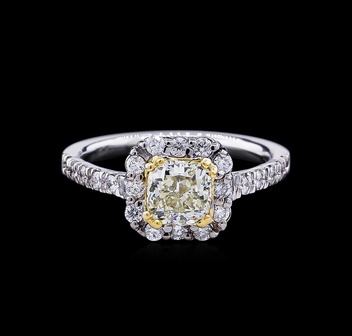 One electronically tested 14KT white and yellow gold lady's combination cast & assembled wedding ring with a cathedral shank with a bright polish finish. The featured lady's ring has a shank measuring 2.03 millimeters wide. Identified with markings of "14K". Condition is new, good workmanship. Containing: One prong set cushion cut diamond, measuring 5.88 x 5.77 x 3.86mm (depth est.) approximate weight of 1.06ct. Graded in the setting. Clarity: VVS-2 Cut Good Twenty-Two prong set round brilliant cut diamonds, measuring 1.80 - 1.75 x 1.12mm (depth est.) approximate total weight of 22 Stones = 0.48ct. Graded in the setting. Clarity: SI-1 to SI-2. Color: G - Very Good. Total Weight of Diamonds 1.54ct. Total Weight of Ring 4.20gm. GAS Appraised at $13,100.00.