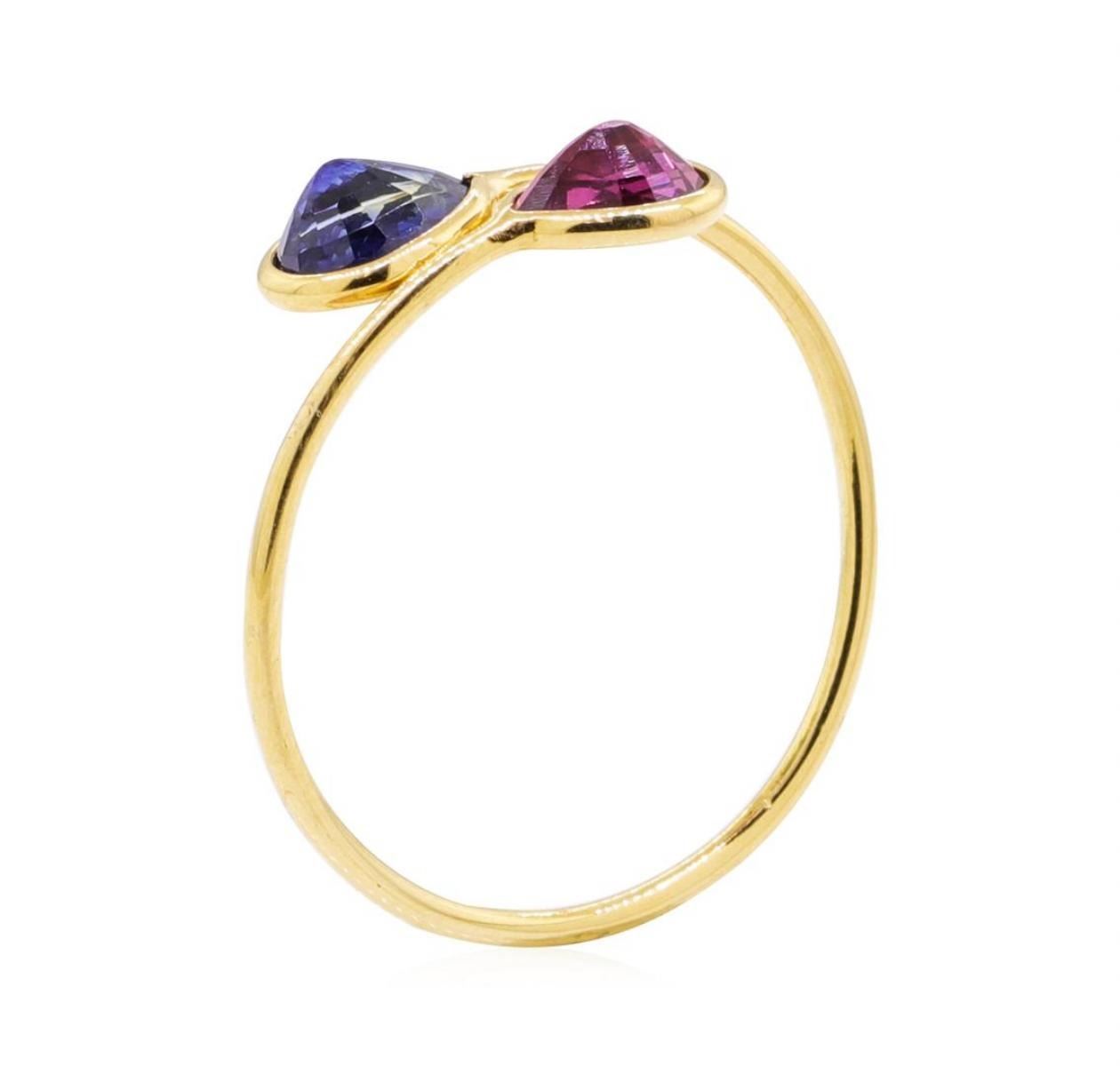 One ring featuring: 18KT yellow gold weighing 1.1 grams containing one ruby weighing 0.77ct and one sapphire weighing 0.77ct.