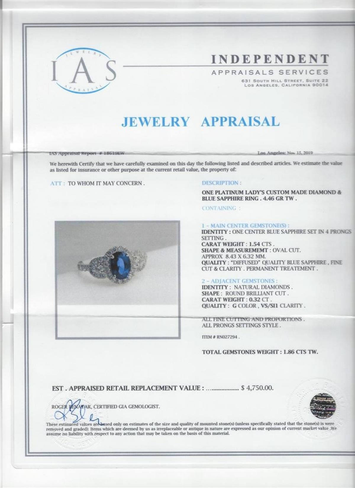 One 1.54ct Tanzanite and Diamond Ring - Platinum. IAS certified. See Appraisal for more details.