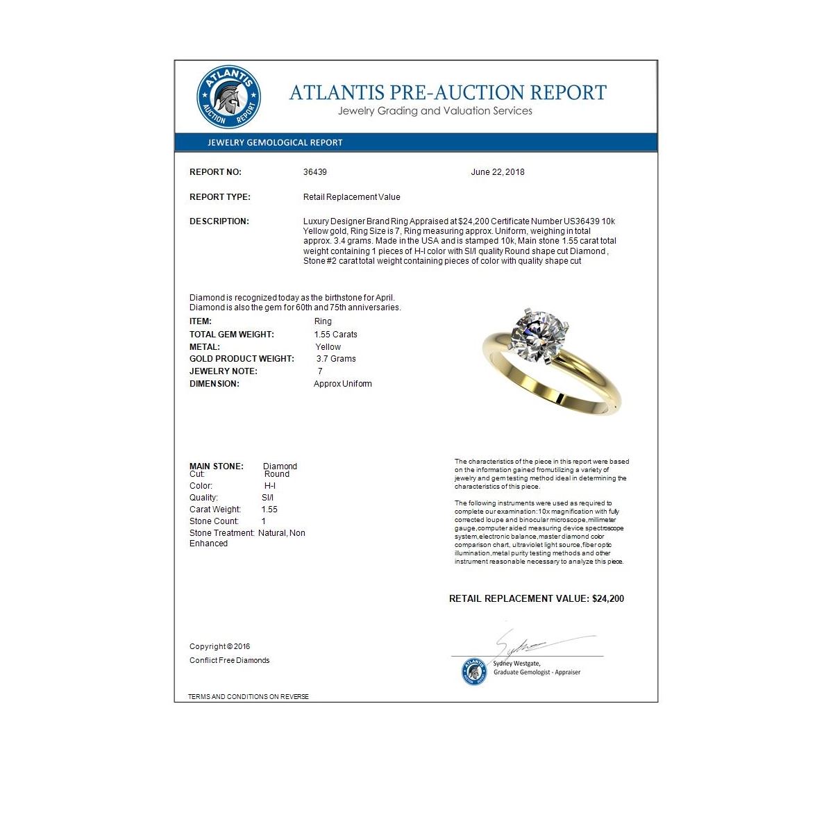 REF-400W2F -36439 ---- 1.55 CTW Certified H-SI/I Quality Diamond Solitaire Engagement Ring 10K Yellow Gold ---- Luxury Designer Brand Ring Appraised at $24,200 Certificate Number US36439 10k Yellow gold, Ring Size is 7, Ring measuring approx. Uniform, weighing in total approx. 3.4 grams. Made in the USA and is stamped 10k, Main stone 1.55 carat total weight containing 1 pieces of H-I color with SI/I quality Round shape cut Diamond , Stone #2 carat total weight containing pieces of color with quality shape cut