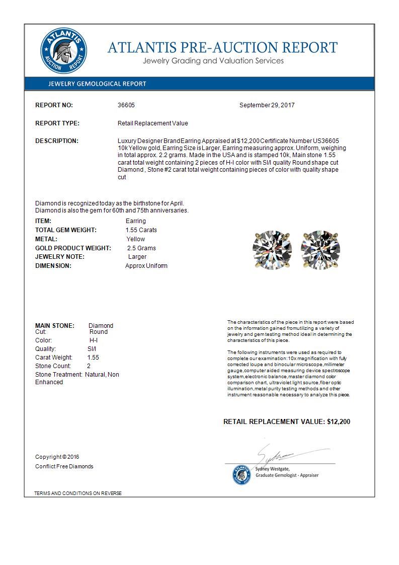 36605 - REF-183A2V ---- 1.55 CTW Certified H-SI/I Quality Diamond Solitaire Stud Earrings 10K Yellow Gold ---- Luxury Designer Brand Earring Appraised at $12,200 Certificate Number US36605 10k Yellow gold, Earring Size is Larger, Earring measuring approx. Uniform, weighing in total approx. 2.2 grams. Made in the USA and is stamped 10k, Main stone 1.55 carat total weight containing 2 pieces of H-I color with SI/I quality Round shape cut Diamond , Stone #2 carat total weight containing pieces of color with quality shape cut