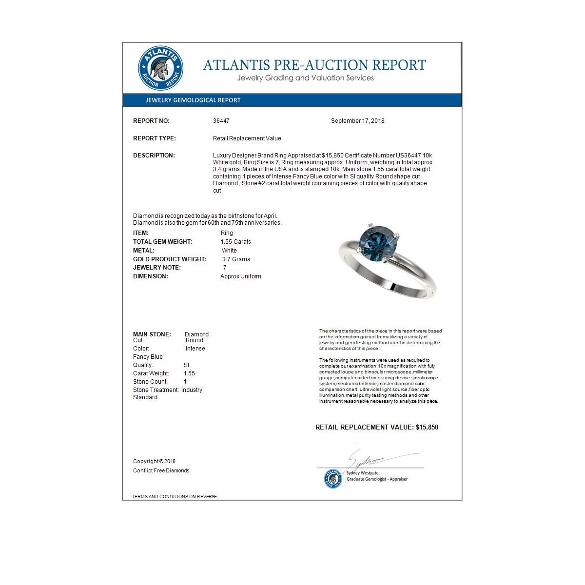 REF-240A2X -36447 ---- 1.55 CTW Certified Intense Blue SI Diamond Solitaire Engagement Ring 10K White Gold ---- Luxury Designer Brand Ring Appraised at $15,850 Certificate Number US36447 10k White gold, Ring Size is 7, Ring measuring approx. Uniform, weighing in total approx. 3.4 grams. Made in the USA and is stamped 10k, Main stone 1.55 carat total weight containing 1 pieces of Intense Fancy Blue color with SI quality Round shape cut Diamond , Stone #2 carat total weight containing pieces of color with quality shape cut