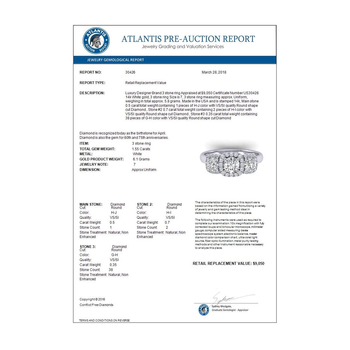 REF-182T5M -30426 ---- 1.55 CTW Certified VS/SI Diamond Solitaire 3 Stone Ring 14K White Gold ---- Luxury Designer Brand 3 stone ring Appraised at $9,050 Certificate Number US30426 14k White gold, 3 stone ring Size is 7, 3 stone ring measuring approx. Uniform, weighing in total approx. 5.8 grams. Made in the USA and is stamped 14k, Main stone 0.5 carat total weight containing 1 pieces of H-J color with VS/SI quality Round shape cut Diamond , Stone #2 0.7 carat total weight containing 2 pieces of H-I color with VS/SI quality Round shape cut Diamond , Stone #3 0.35 carat total weight containing 38 pieces of G-H color with VS/SI quality Round shape cut Diamond