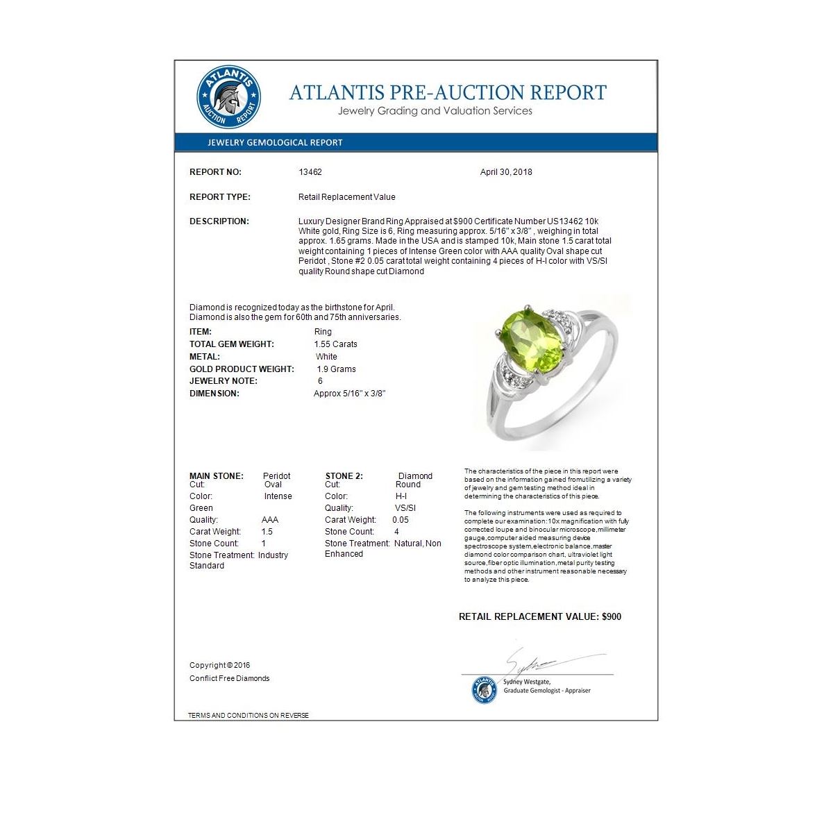 REF-12M9H -13462 ---- 1.55 CTW Peridot & Diamond Ring 10K White Gold ---- Luxury Designer Brand Ring Appraised at $900 Certificate Number US13462 10k White gold, Ring Size is 6, Ring measuring approx. 5/16" x 3/8" , weighing in total approx. 1.65 grams. Made in the USA and is stamped 10k, Main stone 1.5 carat total weight containing 1 pieces of Intense Green color with AAA quality Oval shape cut Peridot , Stone #2 0.05 carat total weight containing 4 pieces of H-I color with VS/SI quality Round shape cut Diamond
