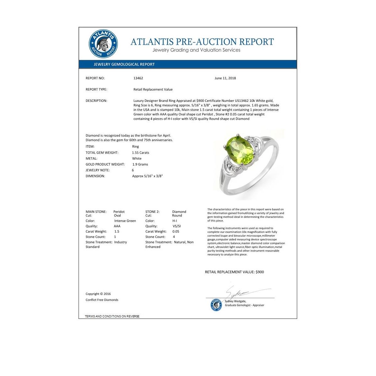 REF-12M9H -13462 ---- 1.55 CTW Peridot & Diamond Ring 10K White Gold ---- Luxury Designer Brand Ring Appraised at $900 Certificate Number US13462 10k White gold, Ring Size is 6, Ring measuring approx. 5/16" x 3/8" , weighing in total approx. 1.65 grams. Made in the USA and is stamped 10k, Main stone 1.5 carat total weight containing 1 pieces of Intense Green color with AAA quality Oval shape cut Peridot , Stone #2 0.05 carat total weight containing 4 pieces of H-I color with VS/SI quality Round shape cut Diamond