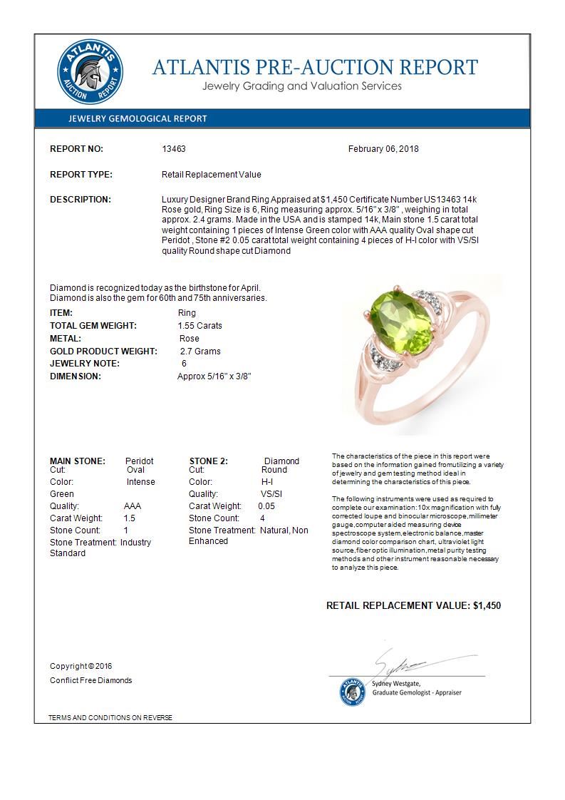 REF-20A2X -13463 ---- 1.55 CTW Peridot & Diamond Ring 14K Rose Gold ---- Luxury Designer Brand Ring Appraised at $1,450 Certificate Number US13463 14k Rose gold, Ring Size is 6, Ring measuring approx. 5/16" x 3/8" , weighing in total approx. 2.4 grams. Made in the USA and is stamped 14k, Main stone 1.5 carat total weight containing 1 pieces of Intense Green color with AAA quality Oval shape cut Peridot , Stone #2 0.05 carat total weight containing 4 pieces of H-I color with VS/SI quality Round shape cut Diamond