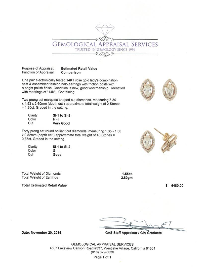 One pair electronically tested 14KT rose gold lady's combination cast & assembled fashion halo earrings with friction posts with a bright polish finish. Identified with markings of "14K". Condition is new, good workmanship. Containing: Two prong set marquise shaped cut diamonds, measuring 8.30 x 4.53 x 2.60mm (depth est.) approximate total weight of 2 Stones = 1.20ct. Graded in the setting. Clarity: SI-1 to SI-2. Color: H - I. Cut Very Good Forty prong set round brilliant cut diamonds, measuring 1.35 - 1.30 x 0.82mm (depth est.) approximate total weight of 40 Stones = 0.35ct. Graded in the setting. Clarity: SI-1 to SI-2. Color: G - I. Cut Good. Total Weight of Diamonds 1.55ct. Total Weight of Earrings 2.80gm. GAS Appraised at $6,480.00.