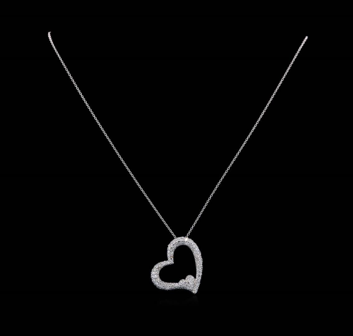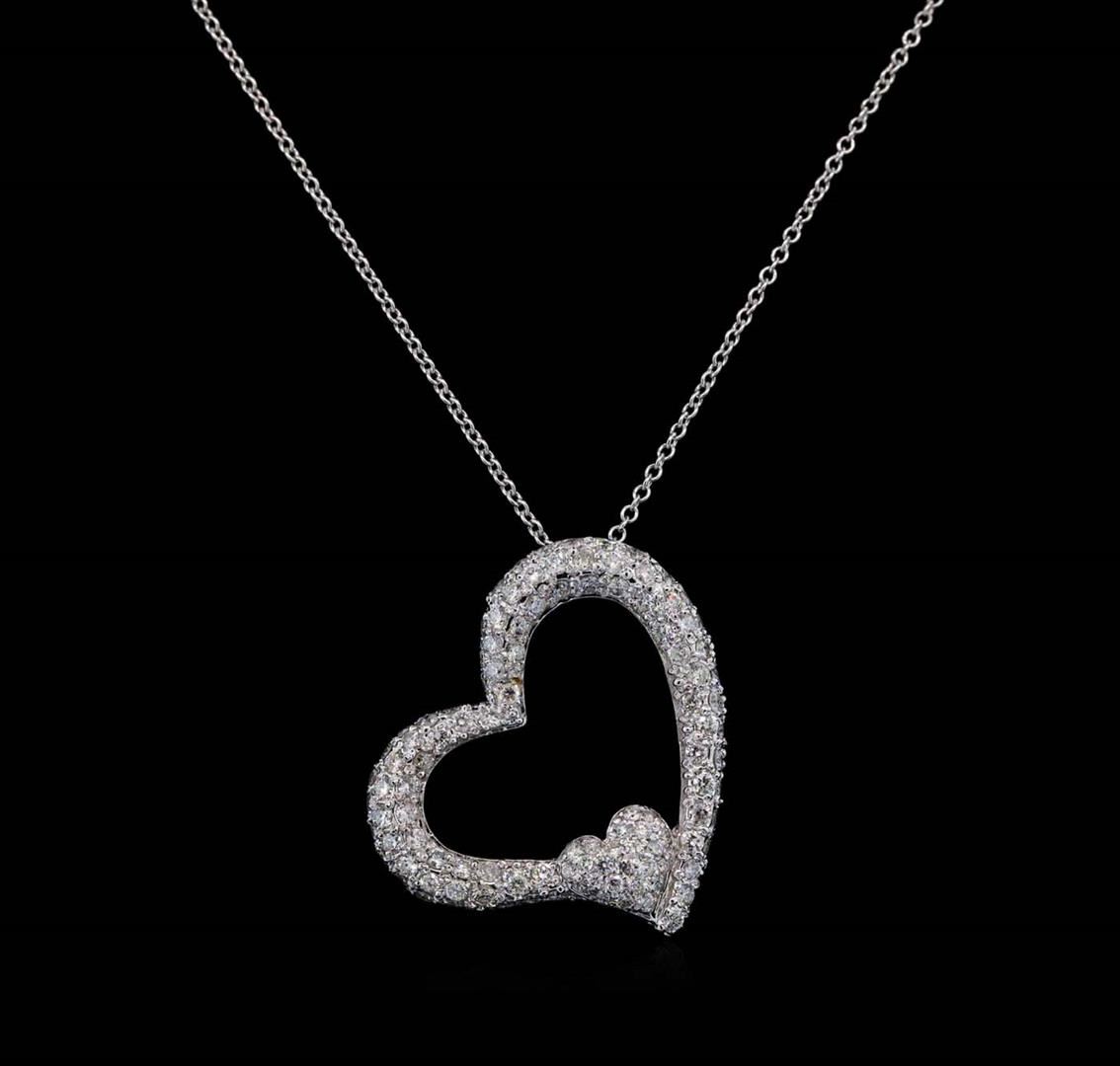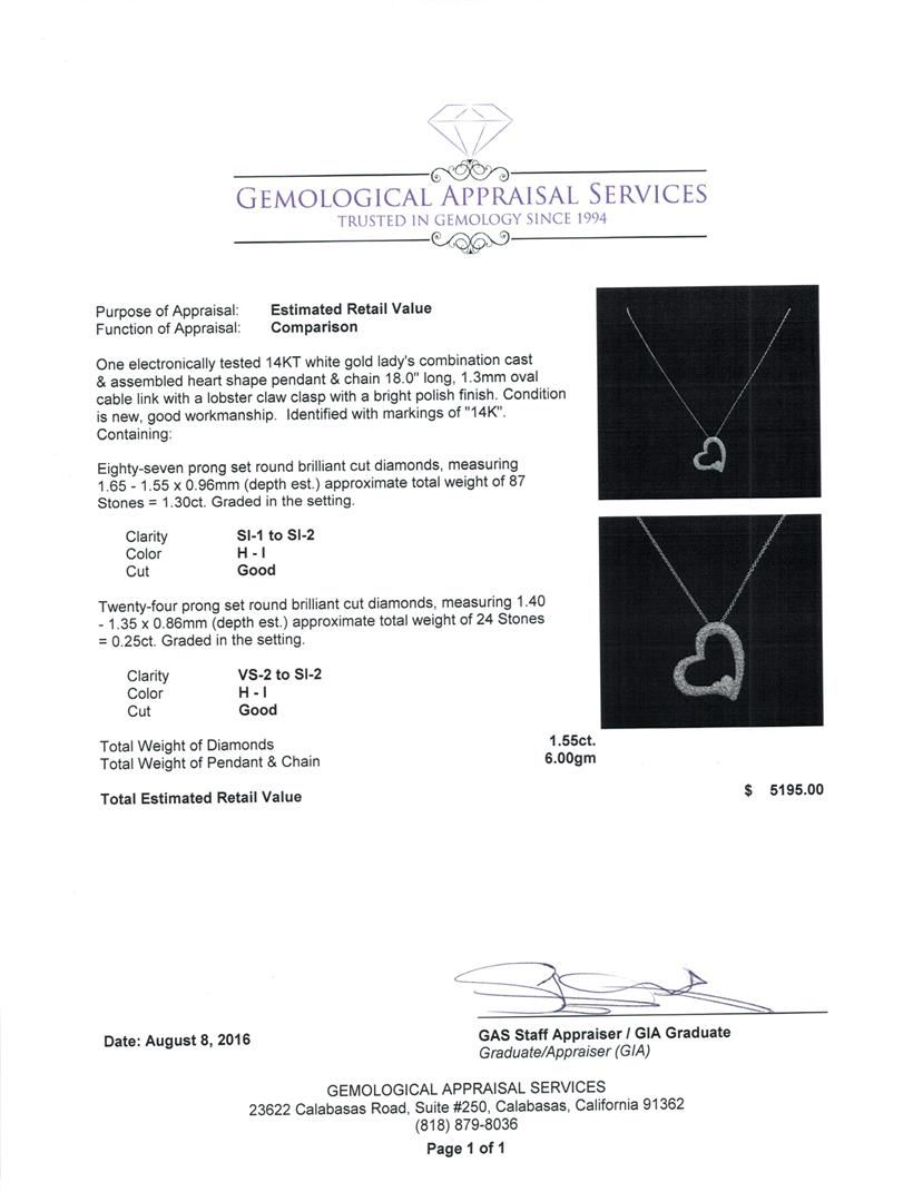 One electronically tested 14KT white gold lady's combination cast & assembled heart shape pendant & chain 18.0' long, 1.3mm oval cable link with a lobster claw clasp with a bright polish finish. Identified with markings of '14K'. Condition is new, good workmanship. Containing: Eighty-Seven prong set round brilliant cut diamonds, measuring 1.65 - 1.55 x 0.96mm (depth est.) approximate total weight of 87 Stones = 1.30ct. Graded in the setting. Clarity SI-1 to SI-2. Color: H - I Cut Good Twenty-Four prong set round brilliant cut diamonds, measuring 1.40 - 1.35 x 0.86mm (depth est.) approximate total weight of 24 Stones = 0.25ct. Graded in the setting. Clarity VS-2 to SI-2. Color: H - I Cut Good. Total Weight of Diamonds 1.55ct.. Total Weight of Pendant & Chain 6.00gm. GAS Appraised at $5,195.00.
