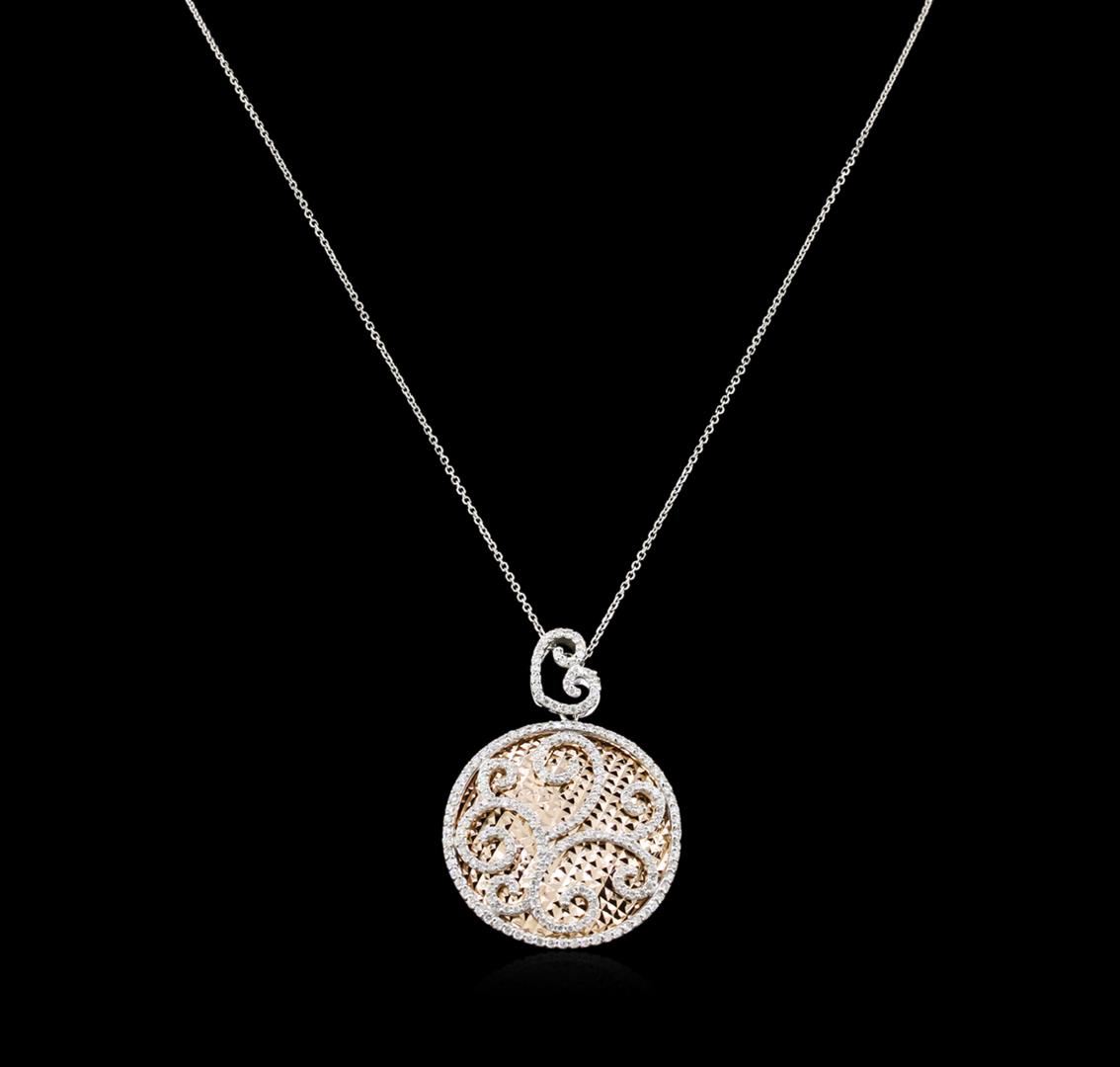 One electronically tested 14KT white and rose gold ladies cast & assembled diamond pendant with chain. The pendant features an elaborate white gold diamond set lattice supported by a rose gold diamond cut disc, completed by a white gold diamond set bail. The pendant is supported by an eighteen inch length 14KT white gold designer style chain, terminating in a spring ring clasp. Bright polish finish. Identified with markings of "K14". Condition is new, good workmanship. Containing: Two Hundred Fourteen prong set round brilliant cut diamonds exact total weight 214 Stones = 1.55ct. Graded in the setting. Clarity: SI-2 to I-2. Color: G - I. Total Weight of Diamonds 1.55ct. Total Weight of Pendant With Chain 17.07gm. AIG Appraised at $7,120.00.