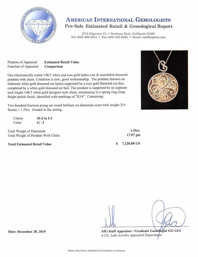 One electronically tested 14KT white and rose gold ladies cast & assembled diamond pendant with chain. The pendant features an elaborate white gold diamond set lattice supported by a rose gold diamond cut disc, completed by a white gold diamond set bail. The pendant is supported by an eighteen inch length 14KT white gold designer style chain, terminating in a spring ring clasp. Bright polish finish. Identified with markings of "K14". Condition is new, good workmanship. Containing: Two Hundred Fourteen prong set round brilliant cut diamonds exact total weight 214 Stones = 1.55ct. Graded in the setting. Clarity: SI-2 to I-2. Color: G - I. Total Weight of Diamonds 1.55ct. Total Weight of Pendant With Chain 17.07gm. AIG Appraised at $7,120.00.