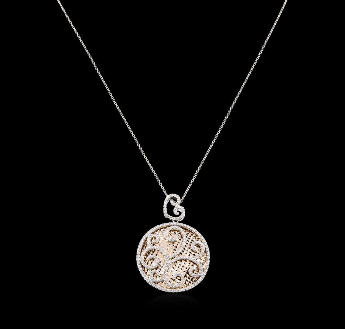 One electronically tested 14KT white and rose gold ladies cast & assembled diamond pendant with chain. The pendant features an elaborate white gold diamond set lattice supported by a rose gold diamond cut disc, completed by a white gold diamond set bail. The pendant is supported by an eighteen inch length 14KT white gold designer style chain, terminating in a spring ring clasp. Bright polish finish. Identified with markings of "K14". Condition is new, good workmanship. Containing: Two Hundred Fourteen prong set round brilliant cut diamonds exact total weight 214 Stones = 1.55ct. Graded in the setting. Clarity: SI-2 to I-2. Color: G - I. Total Weight of Diamonds 1.55ct. Total Weight of Pendant With Chain 17.07gm. AIG Appraised.