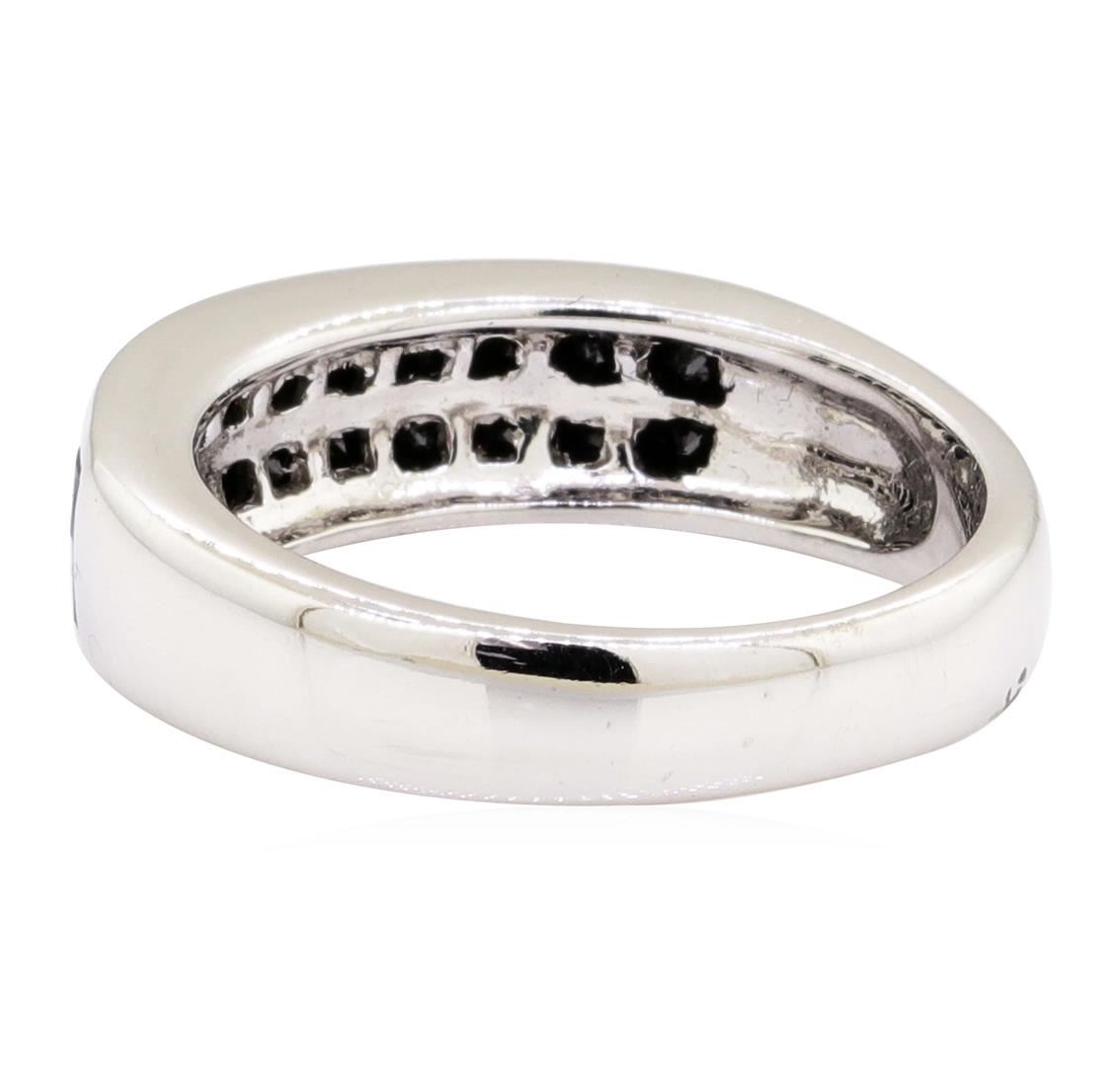 One electronically tested 14KT white gold lady's cast fashion ring with a straight line two row motif with a bright polish finish. The featured lady's ring has a shank measuring 3.90 millimeters wide. Identified with markings of '14K'. Condition is new, good workmanship. Containing: Twenty channel set princess cut treated diamonds, measuring 2.40 x 2.30 x 1.73mm (depth est.) approximate total weight of 20 Stones = 1.55ct. Colored gemstones are presumed to have been subjected to commonly used enhancement processes. Graded in the setting. Color Fancy Black Cut Very Good. Total Weight of Diamonds 1.55ct.. Total Weight of Ring 5.60gm GAS Appraised at $2355.00. GAS Appraised at $2,355.00.