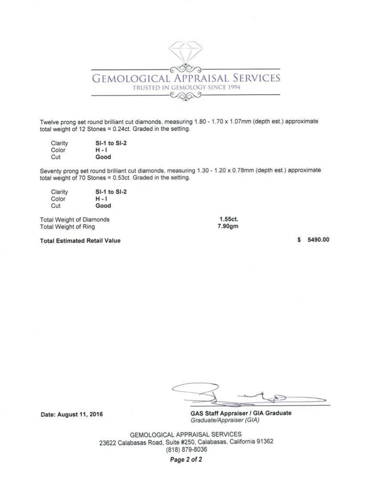 One electronically tested 14KT white gold lady's combination cast & assembled fashion ring with a split shank with a bright polish finish. The featured lady's ring has four circular diamond clusters and a shank measuring 2.91 millimeters wide. Identified with markings of '585'. Condition is new, good workmanship. Containing: One prong set round brilliant cut diamond, measuring 3.45 - 3.40 x 2.13mm (depth est.) approximate weight of 0.15ct. Graded in the setting. Clarity SI-1. Color: I - J Cut Very Good Eight prong set round brilliant cut diamonds, measuring 2.40 - 2.35 x 1.45mm (depth est.) approximate total weight of 8 Stones = 0.40ct. Graded in the setting. Clarity SI-1 to I-1. Color: H - J Cut Good One prong set round brilliant cut diamond, measuring 2.70 - 2.65 x 1.61mm (depth est.) approximate weight of 0.07ct. Graded in the setting. Clarity SI-2. Color: H Cut Good Six prong set round brilliant cut diamonds, measuring 2.00 - 1.90 x 1.17mm (depth est.) approximate total weight of 6 Stones = 0.16ct. Graded in the setting. Clarity SI-1 to SI-2. Color: H - I Cut Good Twelve prong set round brilliant cut diamonds, measuring 1.80 - 1.70 x 1.07mm (depth est.) approximate total weight of 12 Stones = 0.24ct. Graded in the setting. Clarity SI-1 to SI-2. Color: H - I Cut Good Seventy prong set round brilliant cut diamonds, measuring 1.30 - 1.20 x 0.78mm (depth est.) approximate total weight of 70 Stones = 0.53ct. Graded in the setting. Clarity SI-1 to SI-2. Color: H - I Cut Good. Total Weight of Diamonds 1.55ct.. Total Weight of Ring 7.90gm. GAS Appraised.