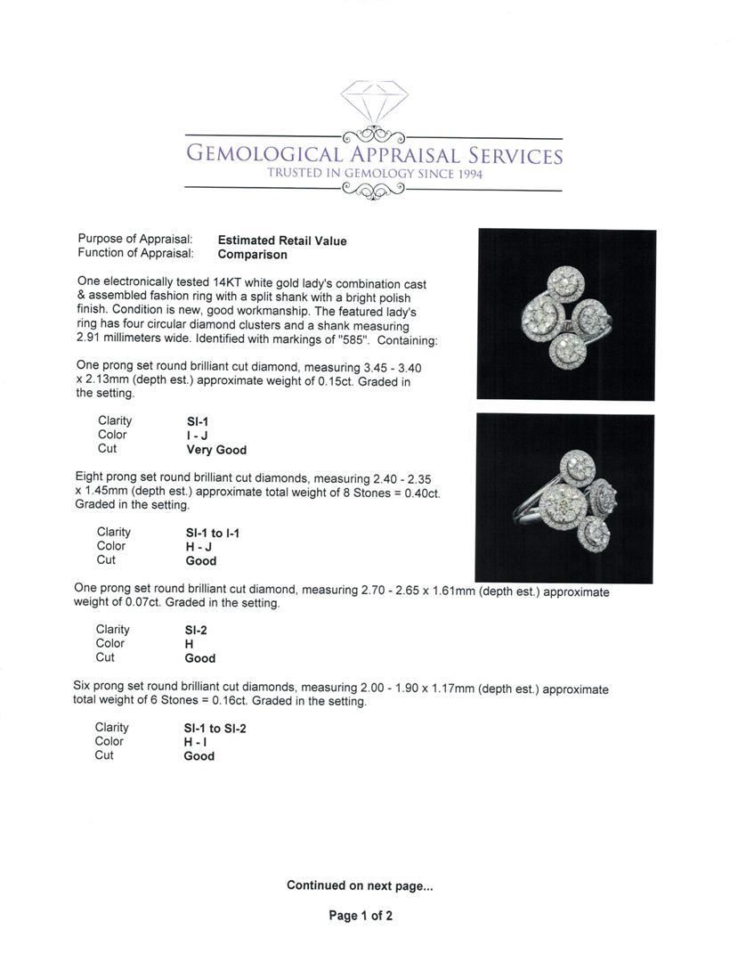 One electronically tested 14KT white gold lady's combination cast & assembled fashion ring with a split shank with a bright polish finish. The featured lady's ring has four circular diamond clusters and a shank measuring 2.91 millimeters wide. Identified with markings of '585'. Condition is new, good workmanship. Containing: One prong set round brilliant cut diamond, measuring 3.45 - 3.40 x 2.13mm (depth est.) approximate weight of 0.15ct. Graded in the setting. Clarity SI-1. Color: I - J Cut Very Good Eight prong set round brilliant cut diamonds, measuring 2.40 - 2.35 x 1.45mm (depth est.) approximate total weight of 8 Stones = 0.40ct. Graded in the setting. Clarity SI-1 to I-1. Color: H - J Cut Good One prong set round brilliant cut diamond, measuring 2.70 - 2.65 x 1.61mm (depth est.) approximate weight of 0.07ct. Graded in the setting. Clarity SI-2. Color: H Cut Good Six prong set round brilliant cut diamonds, measuring 2.00 - 1.90 x 1.17mm (depth est.) approximate total weight of 6 Stones = 0.16ct. Graded in the setting. Clarity SI-1 to SI-2. Color: H - I Cut Good Twelve prong set round brilliant cut diamonds, measuring 1.80 - 1.70 x 1.07mm (depth est.) approximate total weight of 12 Stones = 0.24ct. Graded in the setting. Clarity SI-1 to SI-2. Color: H - I Cut Good Seventy prong set round brilliant cut diamonds, measuring 1.30 - 1.20 x 0.78mm (depth est.) approximate total weight of 70 Stones = 0.53ct. Graded in the setting. Clarity SI-1 to SI-2. Color: H - I Cut Good. Total Weight of Diamonds 1.55ct.. Total Weight of Ring 7.90gm. GAS Appraised.