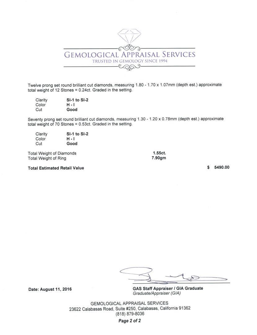 One electronically tested 14KT white gold lady's combination cast & assembled fashion ring with a split shank with a bright polish finish. The featured lady's ring has four circular diamond clusters and a shank measuring 2.91 millimeters wide. Identified with markings of '585'. Condition is new, good workmanship. Containing: One prong set round brilliant cut diamond, measuring 3.45 - 3.40 x 2.13mm (depth est.) approximate weight of 0.15ct. Graded in the setting. Clarity SI-1. Color: I - J Cut Very Good Eight prong set round brilliant cut diamonds, measuring 2.40 - 2.35 x 1.45mm (depth est.) approximate total weight of 8 Stones = 0.40 ct. Graded in the setting. Clarity SI-1 to I-1. Color: H - J Cut Good One prong set round brilliant cut diamond, measuring 2.70 - 2.65 x 1.61mm (depth est.) approximate weight of 0.07ct. Graded in the setting. Clarity SI-2. Color: H Cut Good Six prong set round brilliant cut diamonds, measuring 2.00 - 1.90 x 1.17mm (depth est.) approximate total weight of 6 Stones = 0.16ct. Graded in the setting. Clarity SI-1 to SI-2. Color: H - I Cut Good Twelve prong set round brilliant cut diamonds, measuring 1.80 - 1.70 x 1.07mm (depth est.) approximate total weight of 12 Stones = 0.24ct. Graded in the setting. Clarity SI-1 to SI-2. Color: H - I Cut Good Seventy prong set round brilliant cut diamonds, measuring 1.30 - 1.20 x 0.78mm (depth est.) approximate total weight of 70 Stones = 0.53ct. Graded in the setting. Clarity SI-1 to SI-2. Color: H - I Cut Good. Total Weight of Diamonds 1.55ct.. Total Weight of Ring 7.90gm. GAS Appraised.