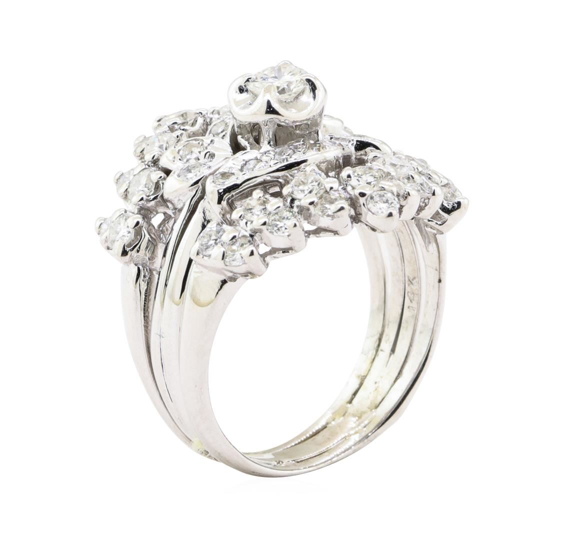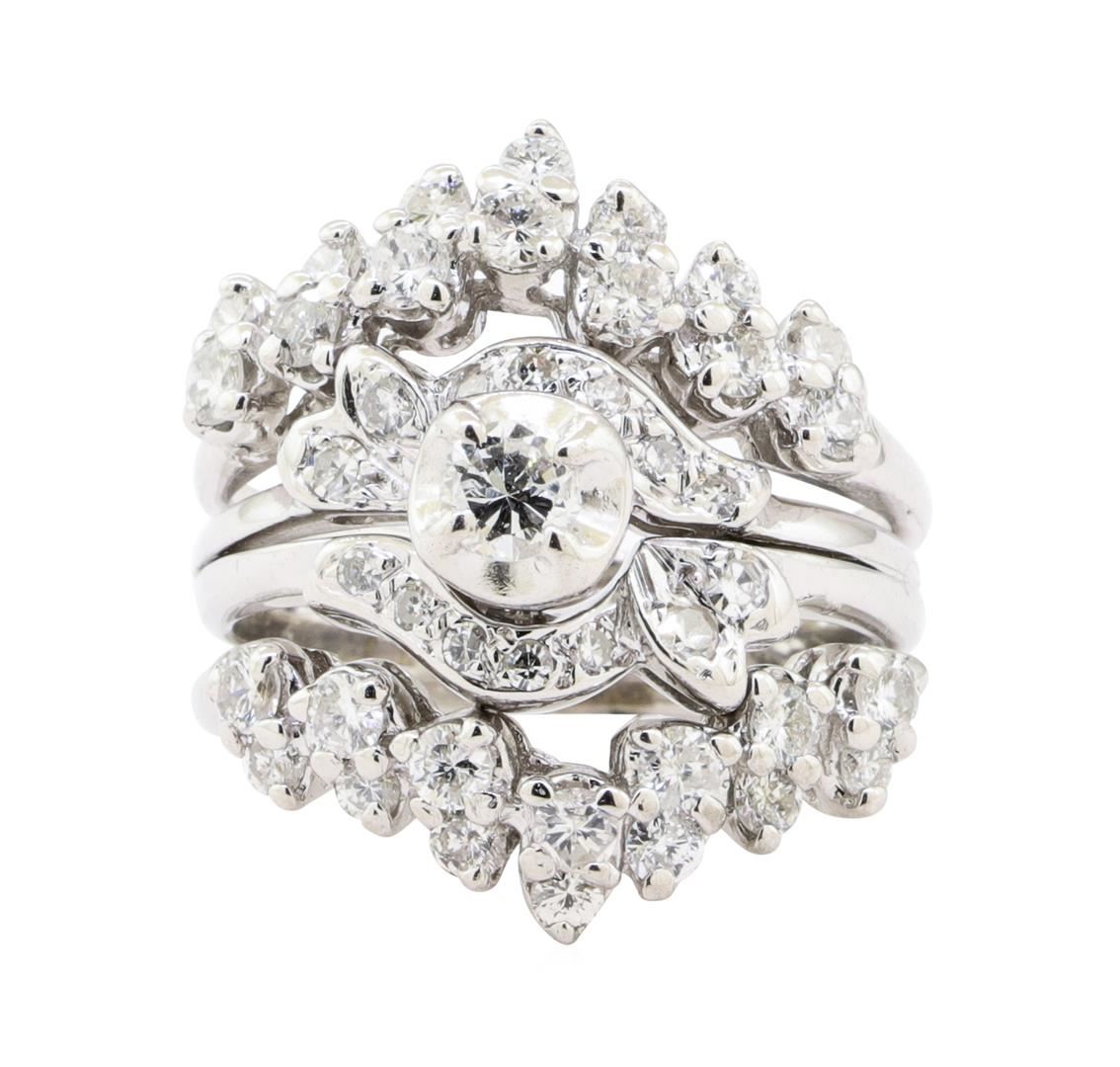 One set electronically tested 14KT white gold lady's combination cast & assembled wedding ring and ring guard with a bright polish finish. The featured lady's ring has a quadruple shank measuring 4.55 millimeters wide. Identified with markings of '14K'. Condition is Good. Containing: One prong set round brilliant cut diamond, measuring 3.71 - 3.68 x 2.29mm (depth est.) approximate weight of 0.20ct. Graded in the setting. Color G - H Clarity I-1 Cut Good Twenty-Eight prong set round brilliant cut diamonds, measuring 2.40 - 2.00 x 1.36mm (depth est.) approximate total weight of 28 Stones = 1.15ct. Graded in the setting. Color H - I Clarity SI-1 to I-1 Cut Good Fourteen prong set single cut diamonds, measuring 1.80 - 1.30 x 0.96mm (depth est.) approximate total weight of 14 Stones = 0.20ct. Graded in the setting. Color H - I Clarity SI-1 to I-1 Cut Good. Total Weight of Diamonds 1.55ct.. Total Weight of Ring And Ring Guard 7.70gm GAS Appraised at $4355.00. GAS Appraised at $4,355.00.