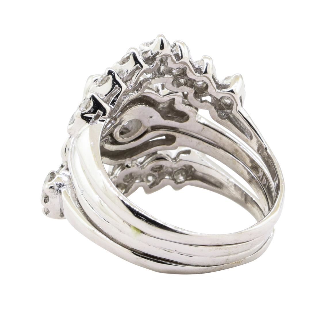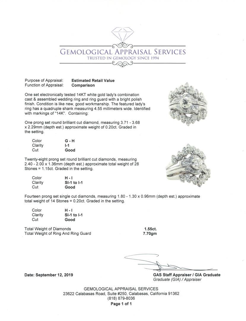 One set electronically tested 14KT white gold lady's combination cast & assembled wedding ring and ring guard with a bright polish finish. The featured lady's ring has a quadruple shank measuring 4.55 millimeters wide. Identified with markings of '14K'. Condition is Good. Containing: One prong set round brilliant cut diamond, measuring 3.71 - 3.68 x 2.29mm (depth est.) approximate weight of 0.20ct. Graded in the setting. Color G - H Clarity I-1 Cut Good Twenty-Eight prong set round brilliant cut diamonds, measuring 2.40 - 2.00 x 1.36mm (depth est.) approximate total weight of 28 Stones = 1.15ct. Graded in the setting. Color H - I Clarity SI-1 to I-1 Cut Good Fourteen prong set single cut diamonds, measuring 1.80 - 1.30 x 0.96mm (depth est.) approximate total weight of 14 Stones = 0.20ct. Graded in the setting. Color H - I Clarity SI-1 to I-1 Cut Good. Total Weight of Diamonds 1.55ct.. Total Weight of Ring And Ring Guard 7.70gm GAS Appraised at  $4355.00. GAS Appraised at $4,355.00.