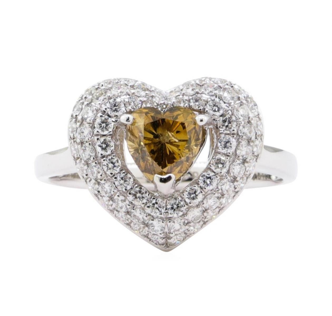 One electronically tested platinum ladies cast & assembled diamond ring. The featured sapphire is set within a diamond heart shaped gallery, supported by a lattice under gallery, completed by a two millimeter wide band. Bright polish finish. Trademark is Orianne. Identified with markings of "PT950". Condition is new, good workmanship. Containing: One prong set heart shaped cut diamond, measuring 5.80 x 5.50 x 4.20mm exact weight 0.91ct. Graded in the setting. Clarity I-2 Color Fancy Yellowish Brown. Depth 76.4% Table 58.2% Seventy-One prong set round brilliant cut diamonds exact total weight 71 Stones = 0.64ct. The clarity grade reflects the overall average for the group. Graded in the setting. Clarity SI-2 to I-1 Color G - I Total Weight of Diamonds 1.55 ct. Total Weight of Ring 4.80 gm Estimated Retail Value
