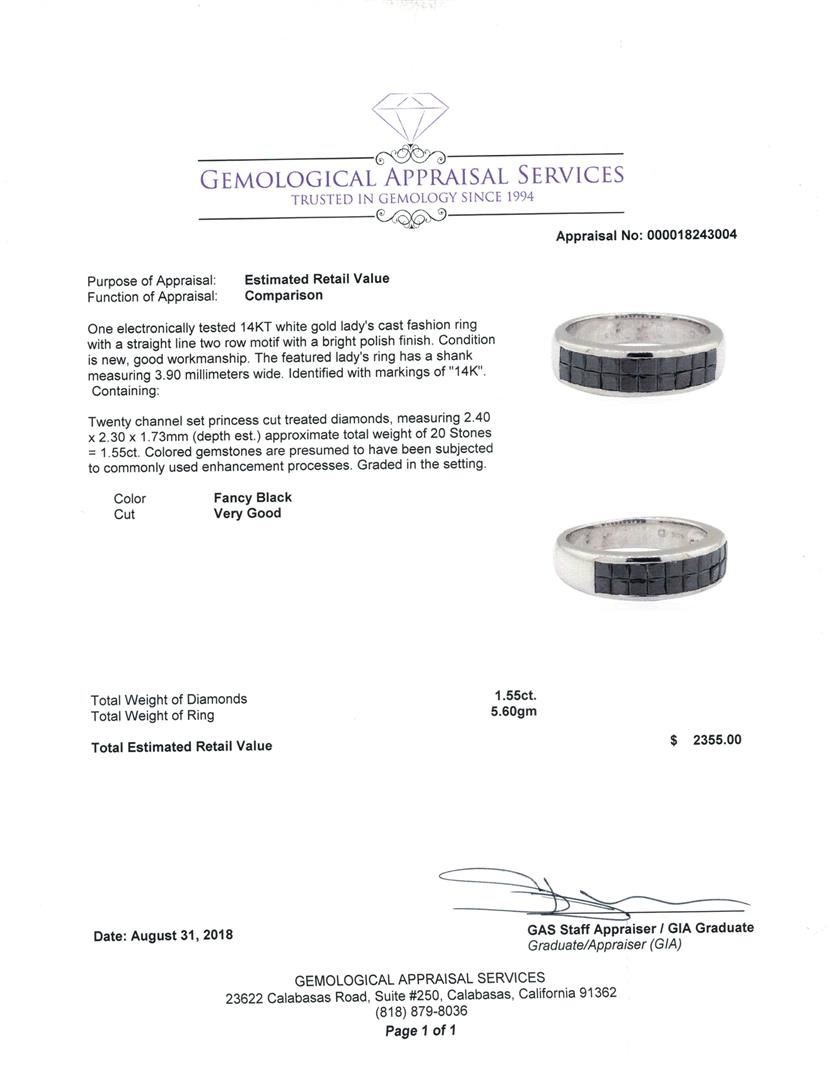One electronically tested 14KT white gold lady's cast fashion ring with a straight line two row motif with a bright polish finish. The featured lady's ring has a shank measuring 3.90 millimeters wide. Identified with markings of '14K'. Condition is new, good workmanship. Containing: Twenty channel set princess cut treated diamonds, measuring 2.40 x 2.30 x 1.73mm (depth est.) approximate total weight of 20 Stones = 1.55ct. Colored gemstones are presumed to have been subjected to commonly used enhancement processes. Graded in the setting. Color Fancy Black Cut Very Good. Total Weight of Diamonds 1.55ct.. Total Weight of Ring 5.60gm GAS Appraised at $2355.00. GAS Appraised.