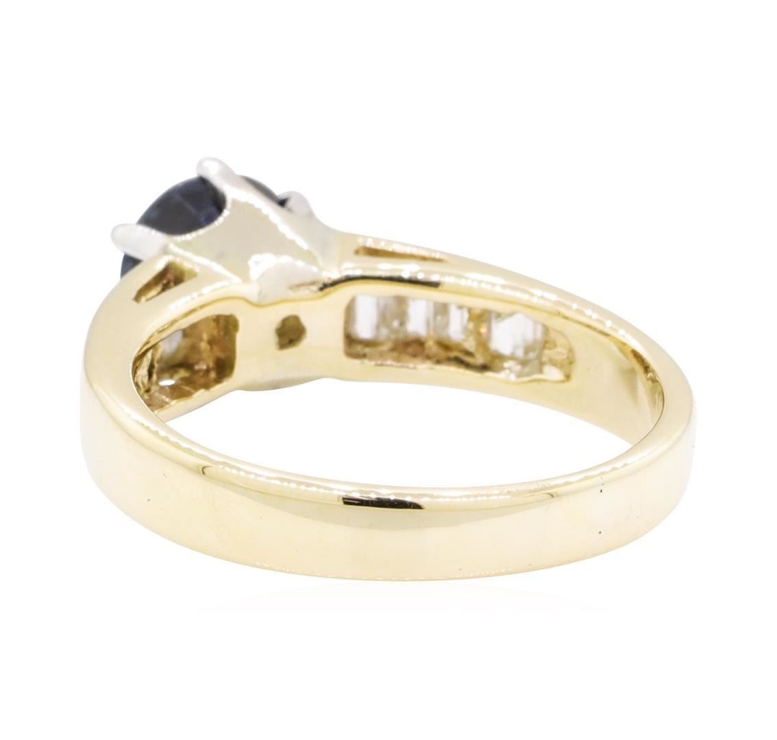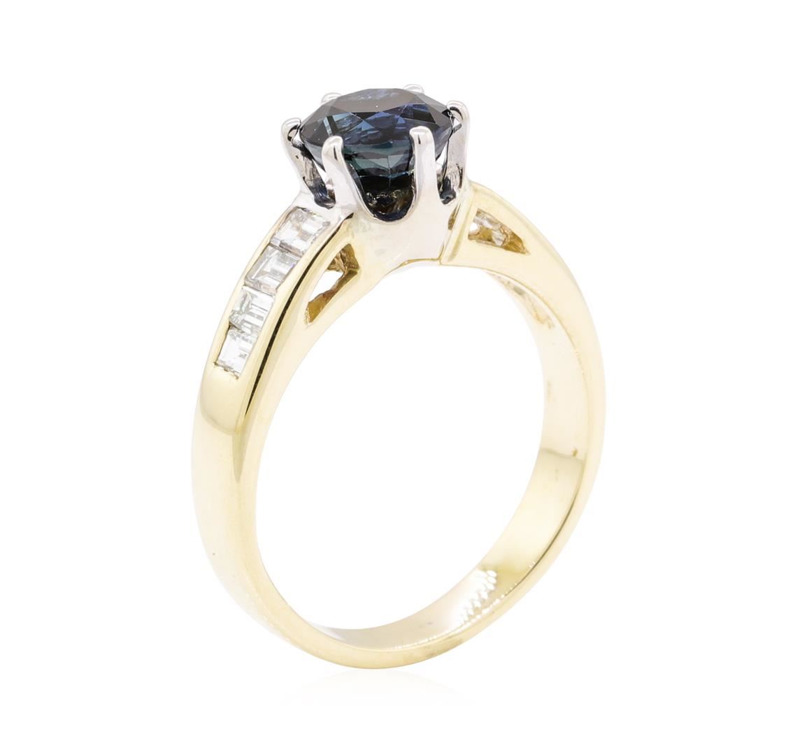 One lady's ring featuring: 14KT yellow and white gold weighing 3.9 grams containing one sapphire weighing 1.55ct and diamonds weighing 0.30ctw.