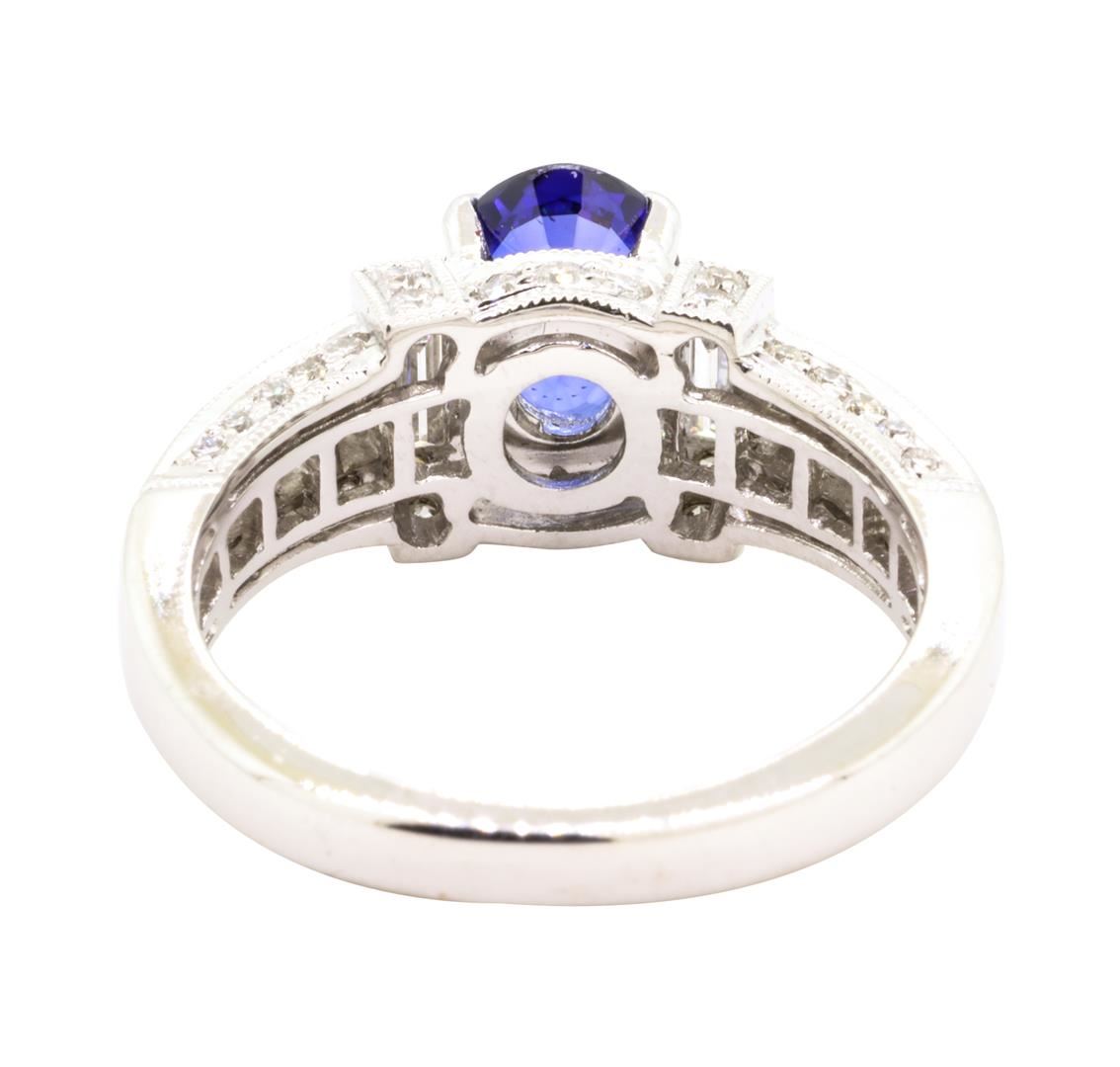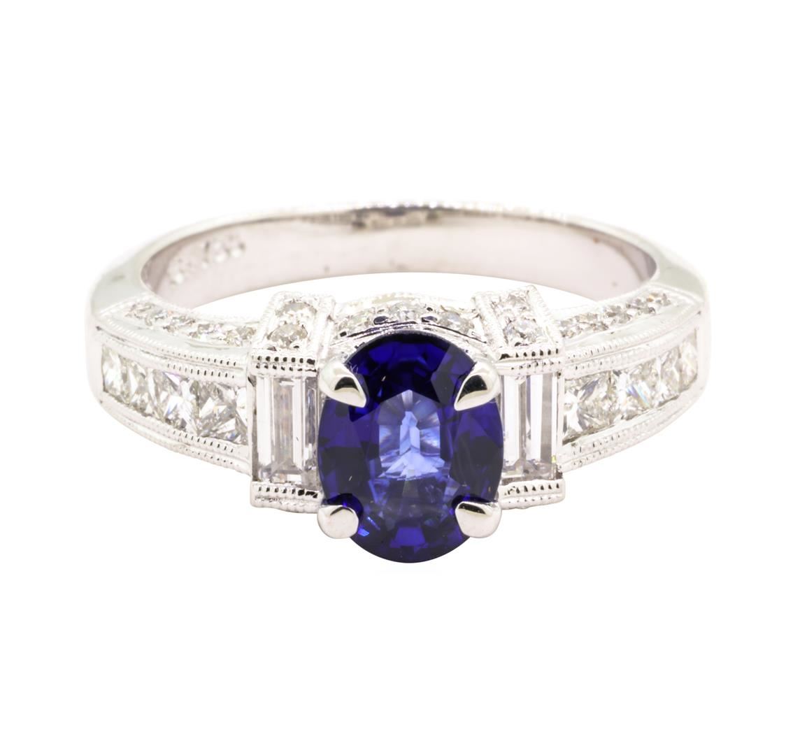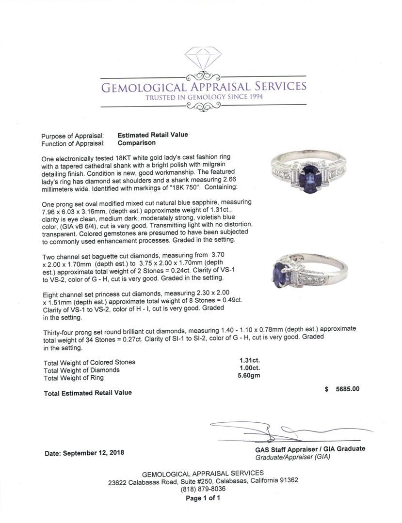 One electronically tested 18KT white gold lady's cast fashion ring with a tapered cathedral shank with a bright polish with milgrain detailing finish. The featured lady's ring has diamond set shoulders and a shank measuring 2.66 millimeters wide. Identified with markings of '18K 750'. Condition is new, good workmanship. Containing: One prong set oval modified mixed cut natural blue sapphire, measuring 7.96 x 6.03 x 3.16mm, (depth est.) approximate weight of 1.31ct., clarity is eye clean, medium dark, moderately strong, violetish blue color, (GIA vB 6/4), cut is very good. Transmitting light with no distortion, transparent. Colored gemstones are presumed to have been subjected to commonly used enhancement processes. Graded in the setting. Two channel set baguette cut diamonds, measuring from 3.70 x 2.00 x 1.70mm (depth est.) to 3.75 x 2.00 x 1.70mm (depth est.) approximate total weight of 2 Stones = 0.24ct. Graded in the setting. Color G - H Clarity VS-1 to VS-2 Cut Very Good Eight channel set princess cut diamonds, measuring 2.30 x 2.00 x 1.51mm (depth est.) approximate total weight of 8 Stones = 0.49ct. Graded in the setting. Color H - I Clarity VS-1 to VS-2 Cut Very Good Thirty-Four prong set round brilliant cut diamonds, measuring 1.40 - 1.10 x 0.78mm (depth est.) approximate total weight of 34 Stones = 0.27ct. Graded in the setting. Color G - H Clarity SI-1 to SI-2 Cut Very Good. Total Weight of Colored Stones 1.31ct.. Total Weight of Diamonds 1.00ct.. Total Weight of Ring 5.60gm GAS Appraised at $5685.00. GAS Appraised at $5,685.00.