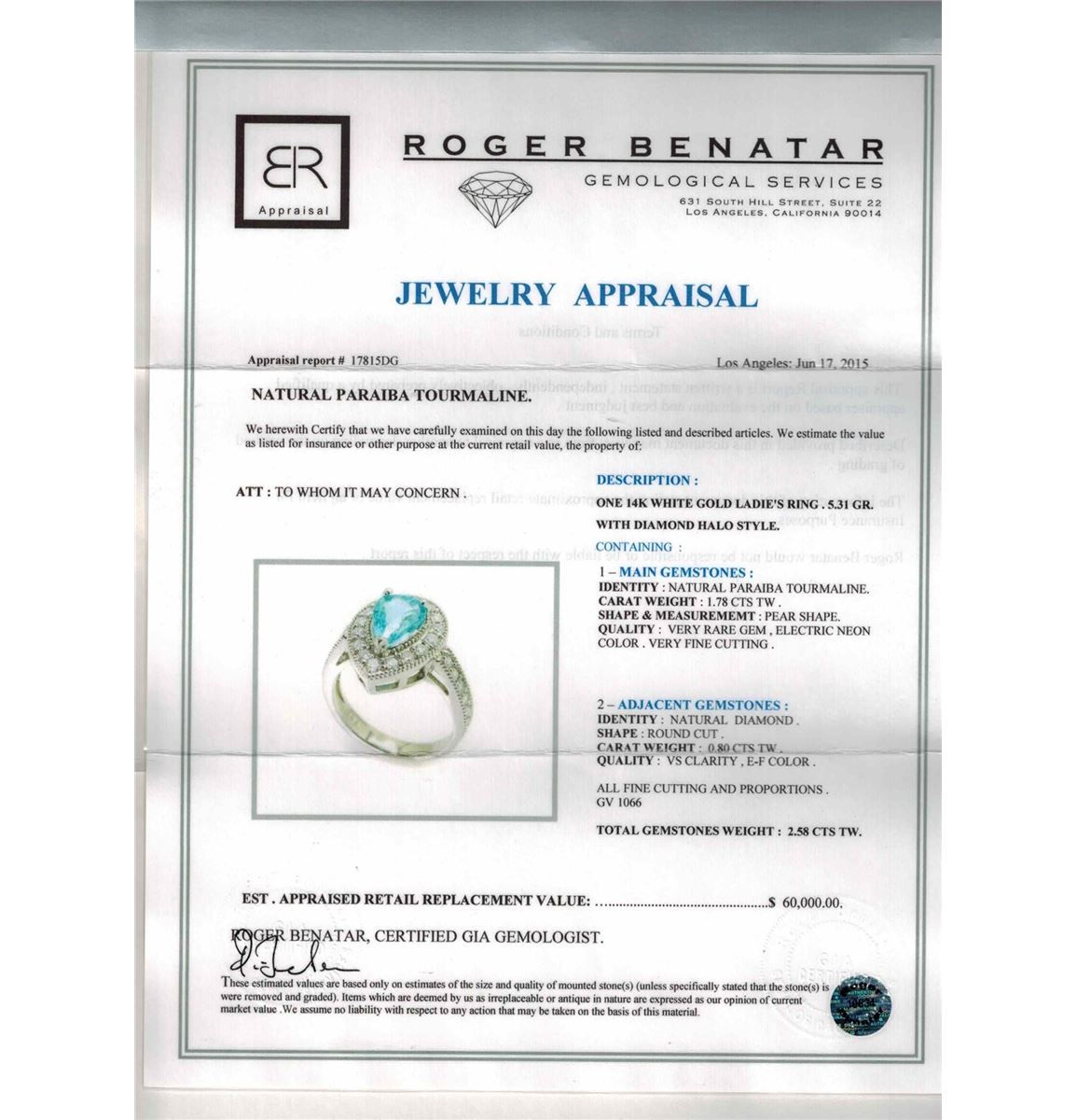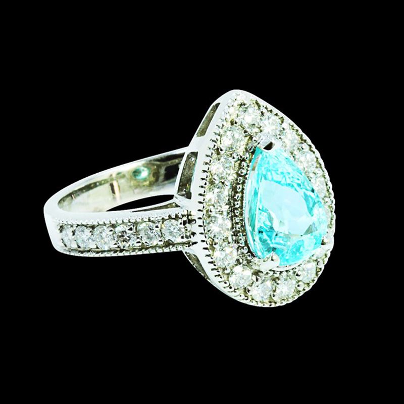 14K WHITE GOLD NATURAL COPPER BEARING PARIBA TOURMALINE RING5.35 GRAMS/DIAMNOND:0.83CT/PARIBA TOURMALINE:1.55CT/#GVR1163