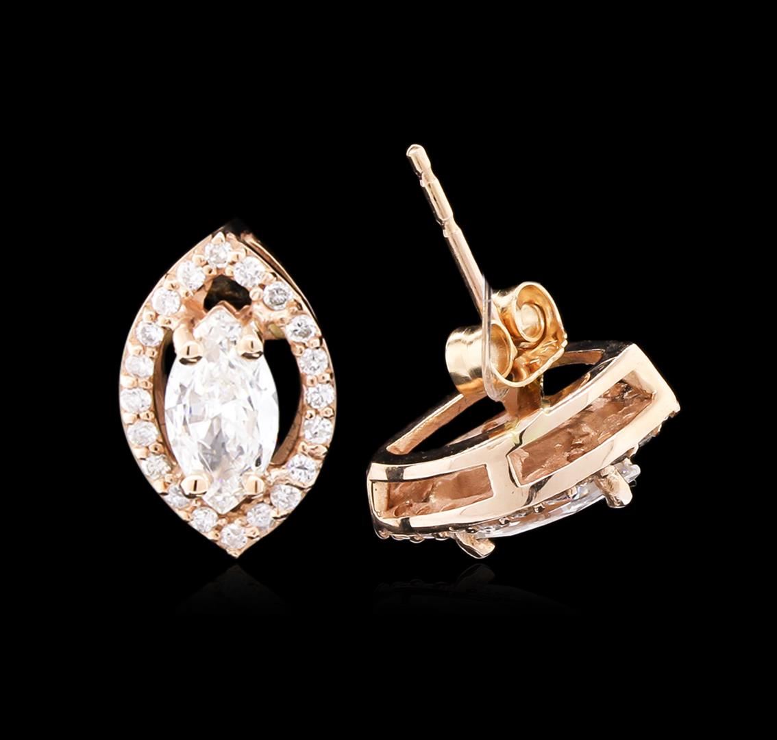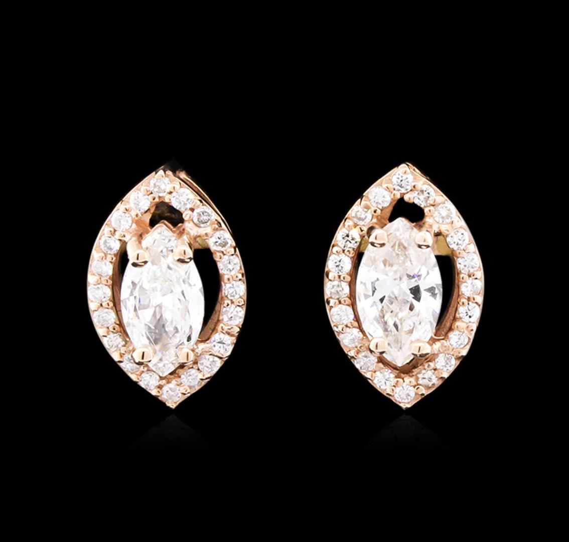 One pair electronically tested 14KT rose gold lady's combination cast & assembled fashion halo earrings with friction posts with a bright polish finish. Identified with markings of "14K". Condition is new, good workmanship. Containing: Two prong set marquise shaped cut diamonds, measuring 8.30 x 4.53 x 2.60mm (depth est.) approximate total weight of 2 Stones = 1.20ct. Graded in the setting. Clarity: SI-1 to SI-2. Color: H - I. Cut Very Good Forty prong set round brilliant cut diamonds, measuring 1.35 - 1.30 x 0.82mm (depth est.) approximate total weight of 40 Stones = 0.35ct. Graded in the setting. Clarity: SI-1 to SI-2. Color: G - I. Cut Good. Total Weight of Diamonds 1.55ct. Total Weight of Earrings 2.80gm. GAS Appraised at $6,480.00.
