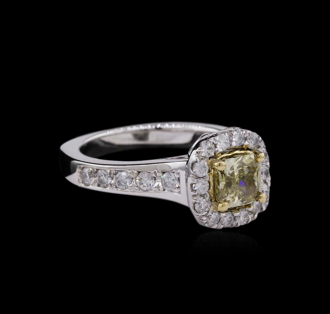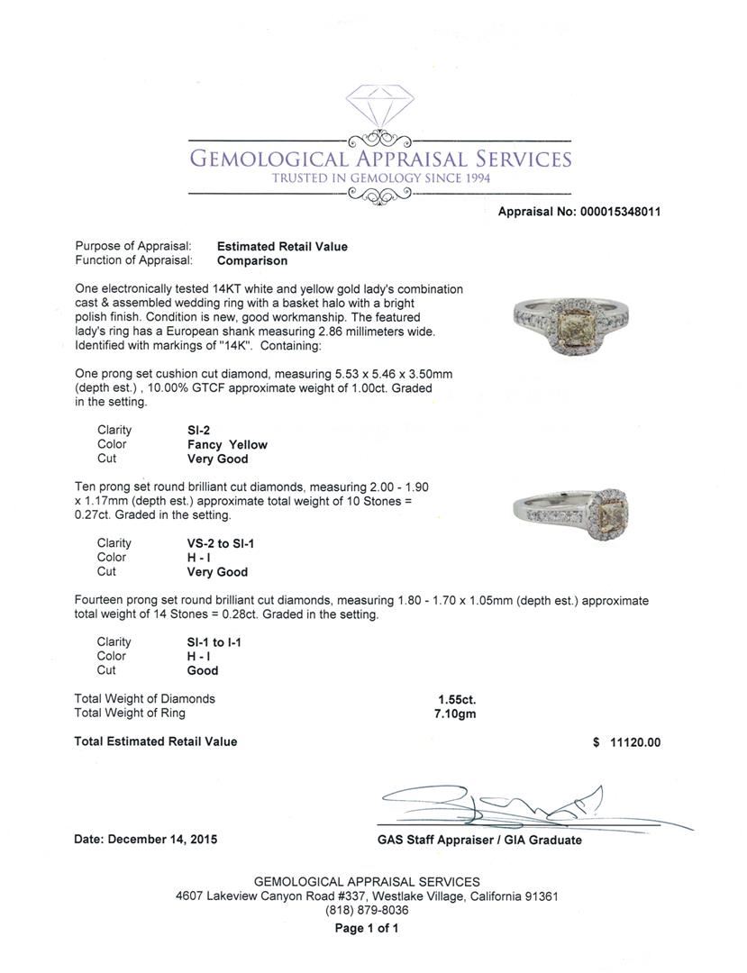 One electronically tested 14KT white and yellow gold lady's combination cast & assembled wedding ring with a basket halo with a bright polish finish. The featured lady's ring has a European shank measuring 2.86 millimeters wide. Identified with markings of "14K". Condition is new, good workmanship. Containing: One prong set cushion cut diamond, measuring 5.53 x 5.46 x 3.50mm (depth est.) , 10.00.%. GTCF approximate weight of 1.00ct. Graded in the setting. Clarity: SI-2 Cut Very Good Ten prong set round brilliant cut diamonds, measuring 2.00 - 1.90 x 1.17mm (depth est.) approximate total weight of 10 Stones = 0.27ct. Graded in the setting. Clarity: VS-2 to SI-1. Color: H - I. Cut Very Good Fourteen prong set round brilliant cut diamonds, measuring 1.80 - 1.70 x 1.05mm (depth est.) approximate total weight of 14 Stones = 0.28ct. Graded in the setting. Clarity: SI-1 to I-1. Color: H - I. Cut Good. Total Weight of Diamonds 1.55ct. Total Weight of Ring 7.10gm. GAS Appraised at $11,120.00.