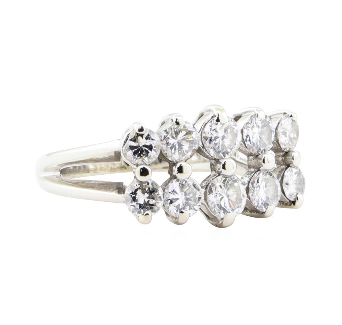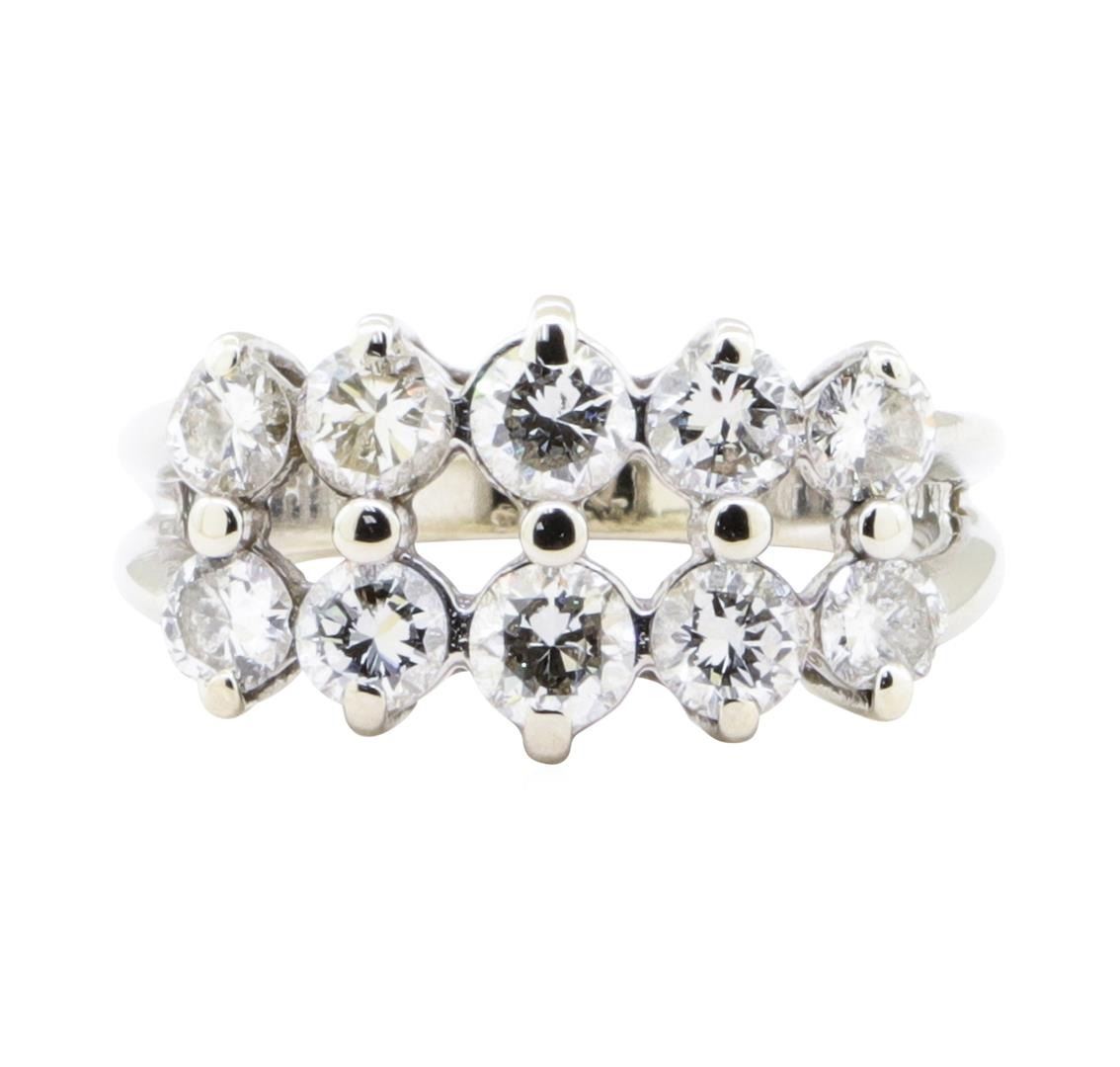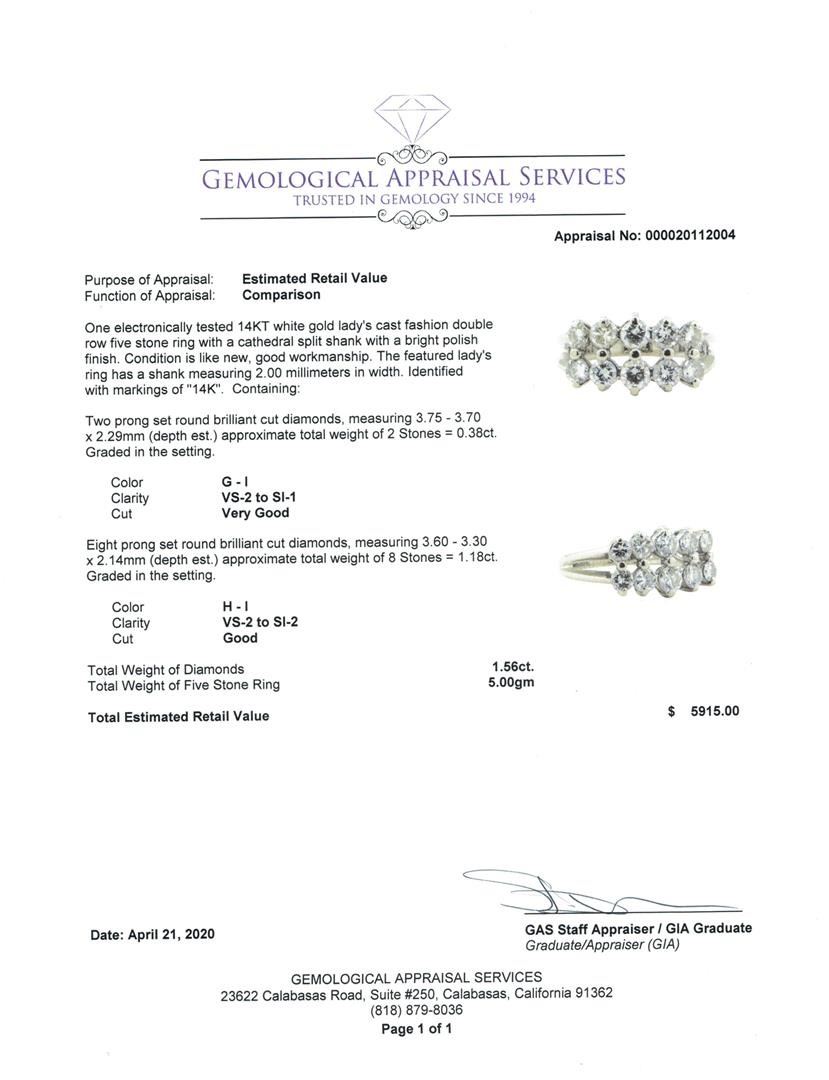 One electronically tested 14KT white gold lady's cast fashion double row five stone ring with a cathedral split shank with a bright polish finish. The featured lady's ring has a shank measuring 2.00 millimeters in width. Identified with markings of '14K'. Condition is Good. Containing: Two prong set round brilliant cut diamonds, measuring 3.75 - 3.70 x 2.29mm (depth est.) approximate total weight of 2 Stones = 0.38ct. Graded in the setting. Color G - I Clarity VS-2 to SI-1 Cut Very Good Eight prong set round brilliant cut diamonds, measuring 3.60 - 3.30 x 2.14mm (depth est.) approximate total weight of 8 Stones = 1.18ct. Graded in the setting. Color H - I Clarity VS-2 to SI-2 Cut Good. Total Weight of Diamonds 1.56ct.. Total Weight of Five Stone Ring 5.00gm GAS Appraised at $5915.00. GAS Appraised.