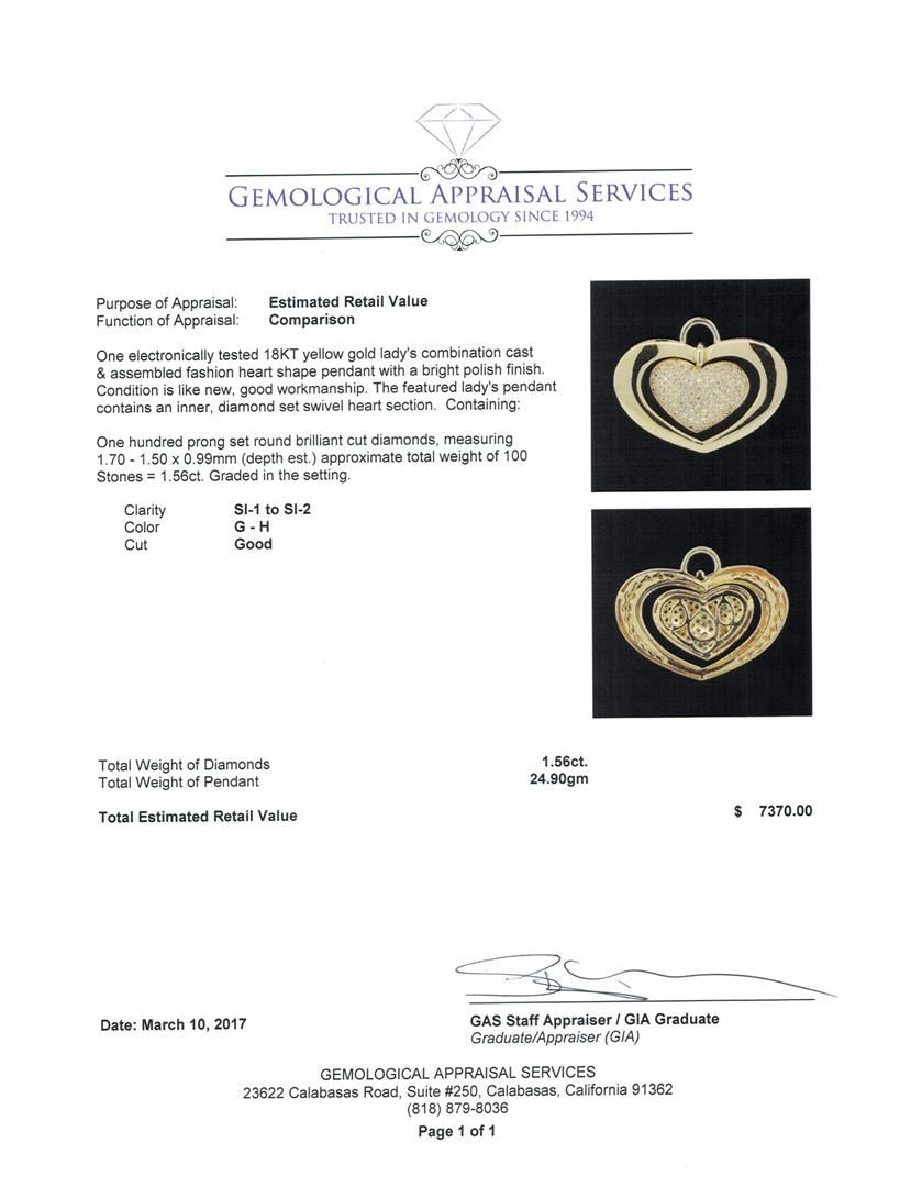 One electronically tested 18KT yellow gold lady's combination cast & assembled fashion heart shape pendant with a bright polish finish. The featured lady's pendant contains an inner, diamond set swivel heart section. Condition is like new, good workmanship. Containing: One Hundred prong set round brilliant cut diamonds, measuring 1.70 - 1.50 x 0.99mm (depth est.) approximate total weight of 100 Stones = 1.56ct. Graded in the setting. Color G - H Clarity SI-1 to SI-2 Cut Good. Total Weight of Diamonds 1.56ct.. Total Weight of Pendant 24.90gm GAS Appraised at $7,370.00.